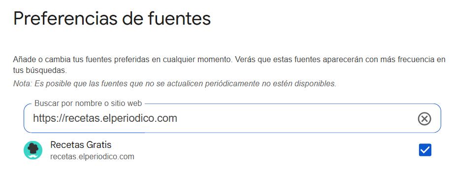 - Accede al enlace directo de Recetas Gratis en la herramienta de fuentes preferidas de Google haciendo click en este mismo enlace.