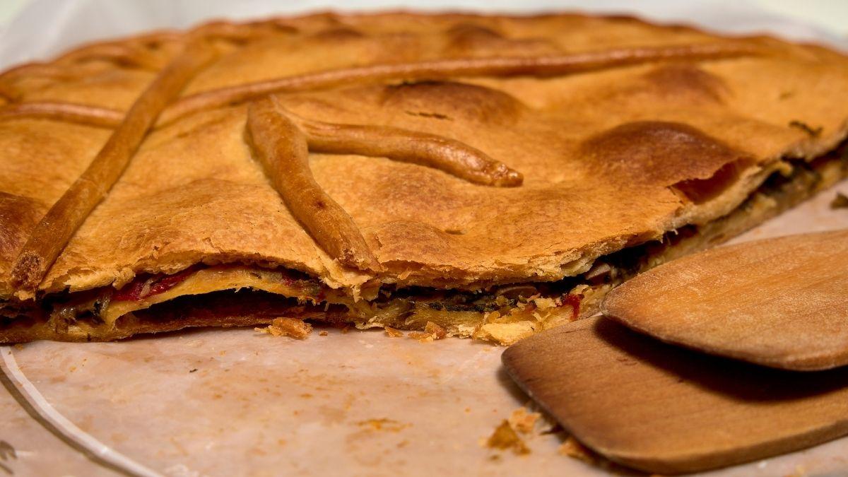 - Hornea: hornea la empanada a 180 ºC hasta que la masa esté dorada y crujiente por fuera. Deja templar, corta en porciones y ¡a disfrutar!