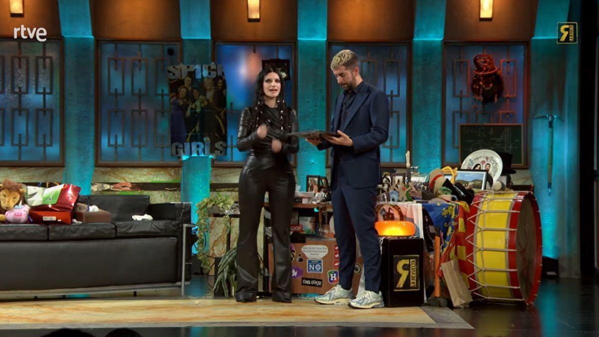Como es habitual en el programa, la cantante italiana sorprendió a Broncano con algunos regalos relacionados también con la cocina italiana. Entre ellos, un libro de recetas y un delantal con la escultura del David de Miguel Ángel, que Laura Pausini presentó con su característico sentido del humor. “Sé que tenéis un David que triunfa; dicen que los David son así. Para cocinar bien el panettone”, dijo entre risas.