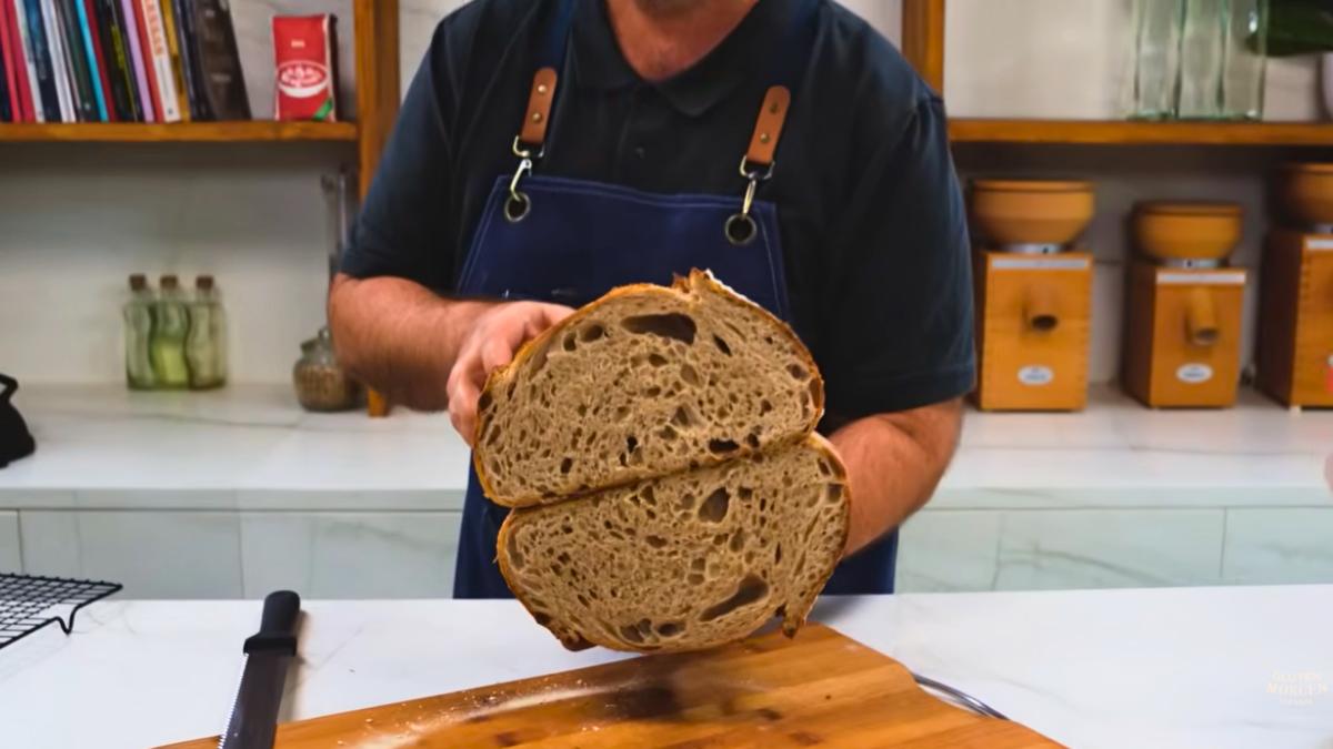 Y es que mientras en cualquier panadería tradicional suele utilizarse alrededor de un 20 % de masa madre, Ramón reduce esa cantidad hasta entre un 0,5 y un 2 % en esta receta. “Hoy vamos a hacer un pan con solo esto de masa madre”, dice al inicio del vídeo, mostrando apenas una cucharada. El resultado final es un pan de casi dos kilos, con una miga aireada, una corteza muy crujiente y un aroma intenso que invita a probarlo al instante.