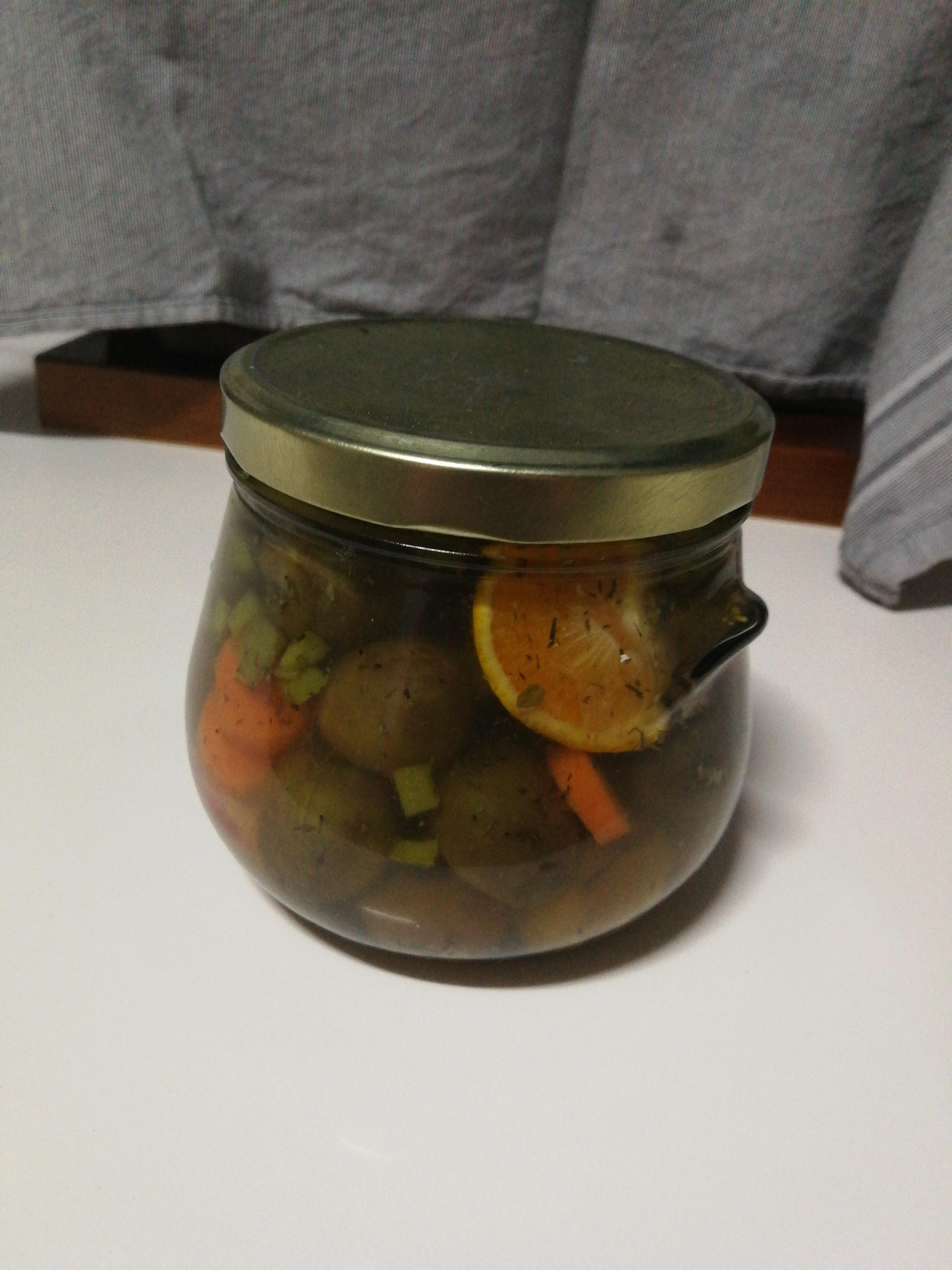 Truco: Como yo tenía las olivas en dos tarros medianos, los ingredientes arriba indicados los dividí en dos y puse la mitad de los ingredientes en cada bote. SI tu tienes las aceitunas en un único bote, pones los ingredientes en el mismo bote todos juntos.