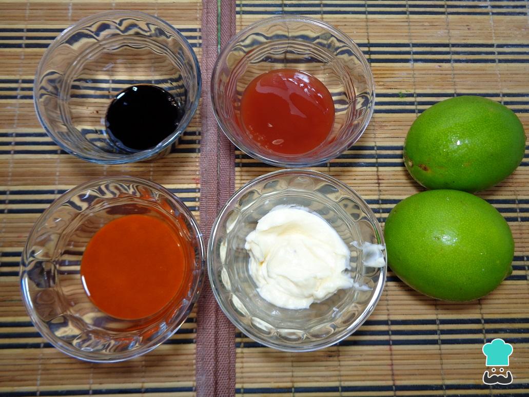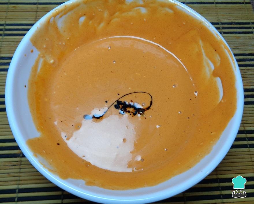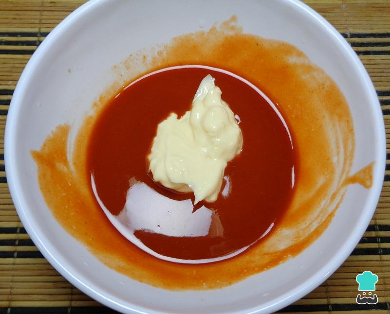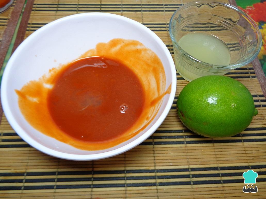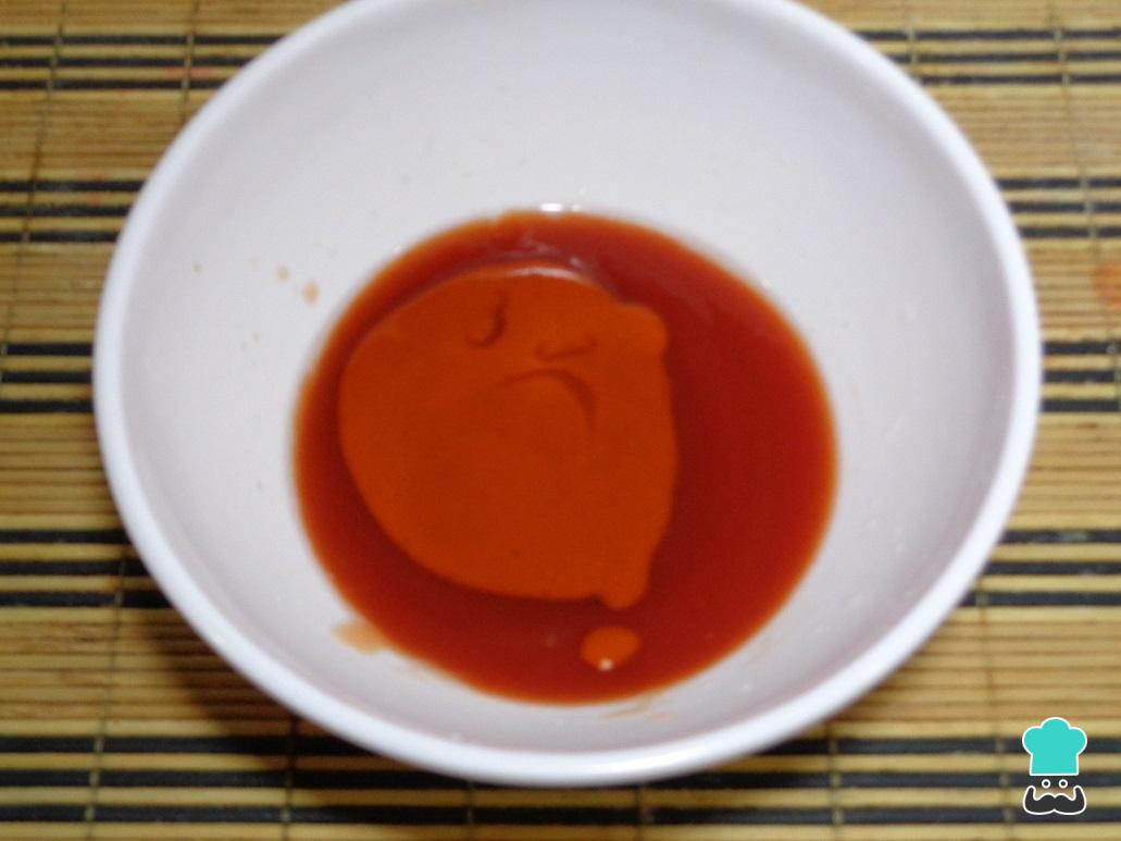 Por otro lado, en un recipiente agregamos la salsa catsup y la salsa valentina, las incorporamos perfectamente.