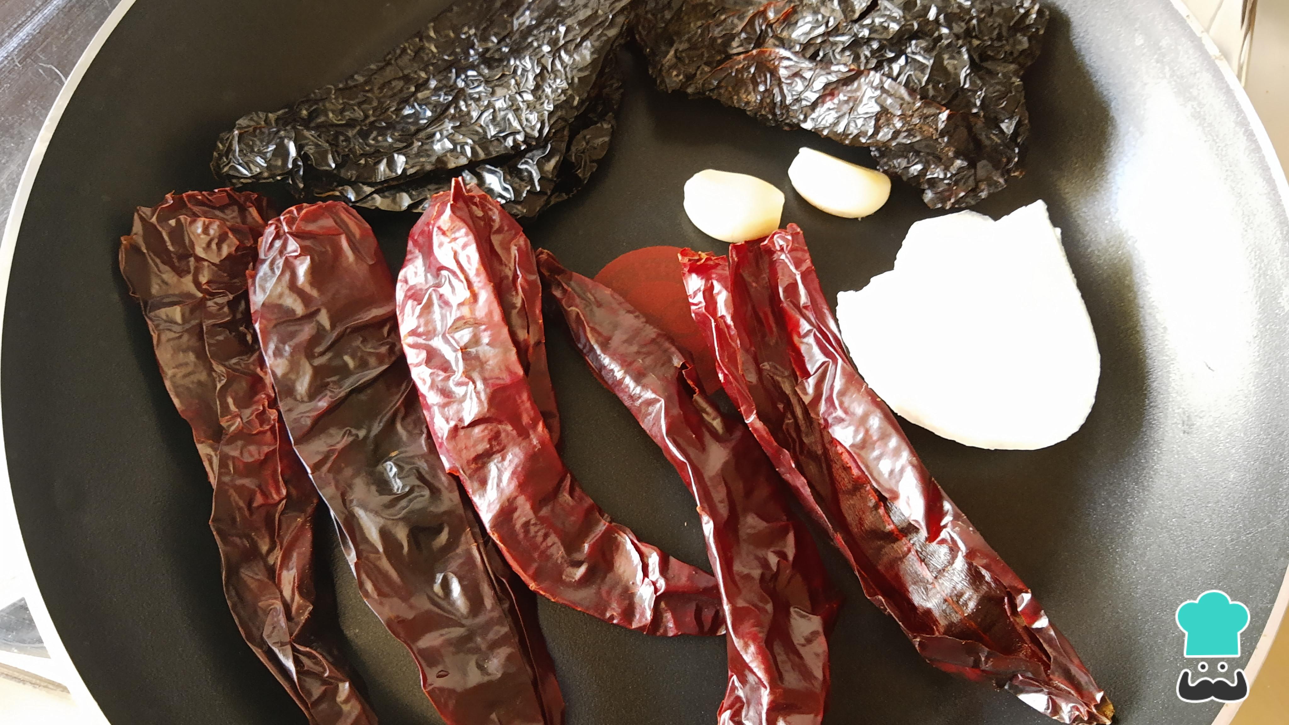 En una sartén o comal caliente, asa los chiles, los dientes de ajo y el trozo de cebolla. Mueve y voltea constantemente los chiles, pues estos se pueden quemar muy rápido y pueden amargar. Por otro lado, asegúrate de que quedan tostados los dientes de ajo y la cebolla. Cuando esté todo listo, retira y reserva.