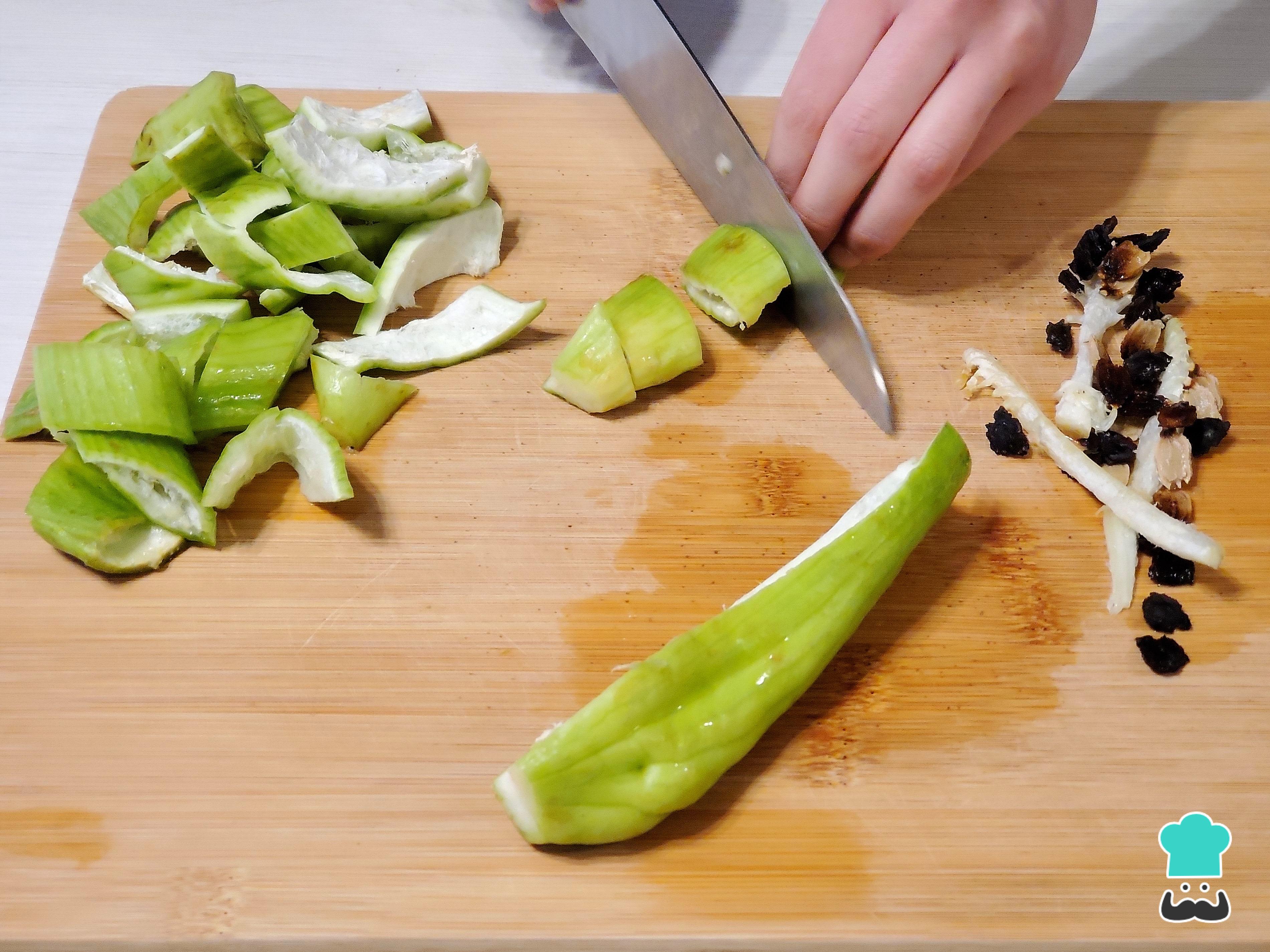 Comienza picando todos los insumos. Para ello, primero lava y corta los extremos de las caiguas. Luego, de forma vertical, córtalos por la mitad y retírales las venas y semillas. Seguidamente, corta estas mitades de forma sesgada en tiras gruesas.