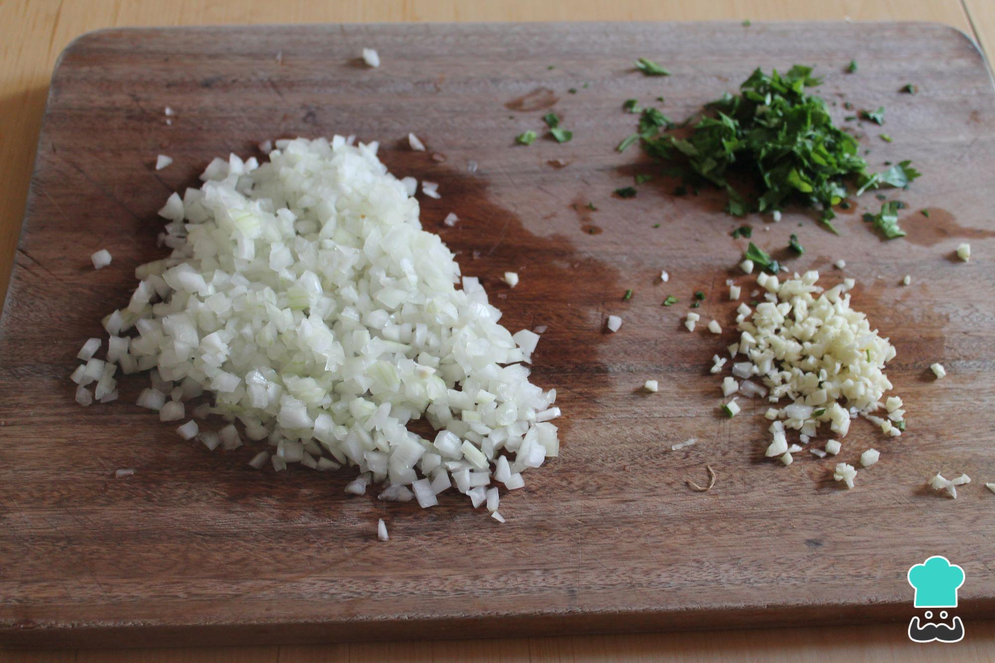 Para empezar con la receta de las albóndigas de choco y gambas, primero elabora las albóndigas y, cuando estén hechas, prepara la salsa. Para ello, pela y pica la cebolla muy finamente para que no te encuentres tropezones excesivos en las albóndigas. A continuación, pela los dientes de ajo, retira el germen de su interior y pica muy finamente. Por último, lava el perejil y pícalo como todo lo anterior, muy finamente, hasta conseguir unas dos cucharadas soperas de perejil picado. Reserva todo.