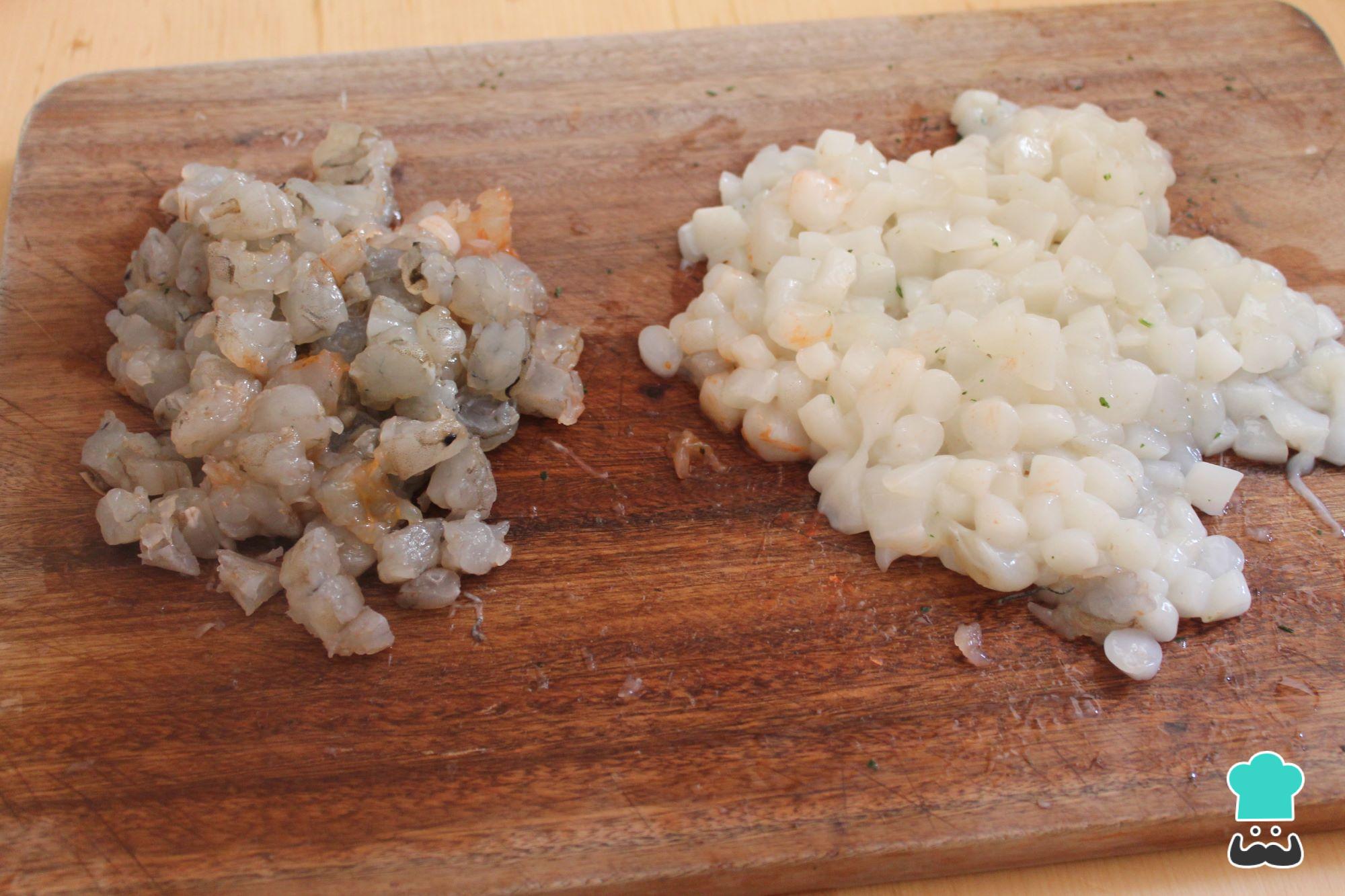 Prepara el choco. Asimismo, corta las partes más duras y quédate solo con las partes más tiernas. A continuación, corta en tiras y, a su vez, en cuadraditos muy pequeños, recuerda que te quedará una textura mejor si no le dejas a las albóndigas tropezones grandes. Luego, pela los langostinos y haz un pequeño corte en su lomo, retira el hilo donde se encuentran los intestinos y trocéalos muy finamente. Añade la sepia y los langostinos troceados en un bol amplio.
