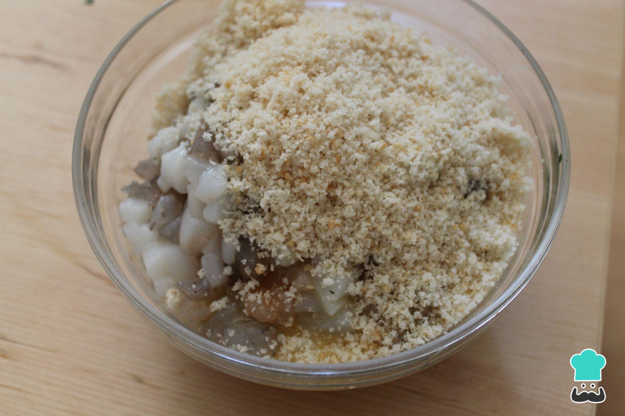 En el bol del choco y de los langostinos incorpora también la cebolla, los ajos y el perejil picado. Añade también un poco de sal, el huevo batido y el pan rallado. Mezcla todo bien con las manos.
