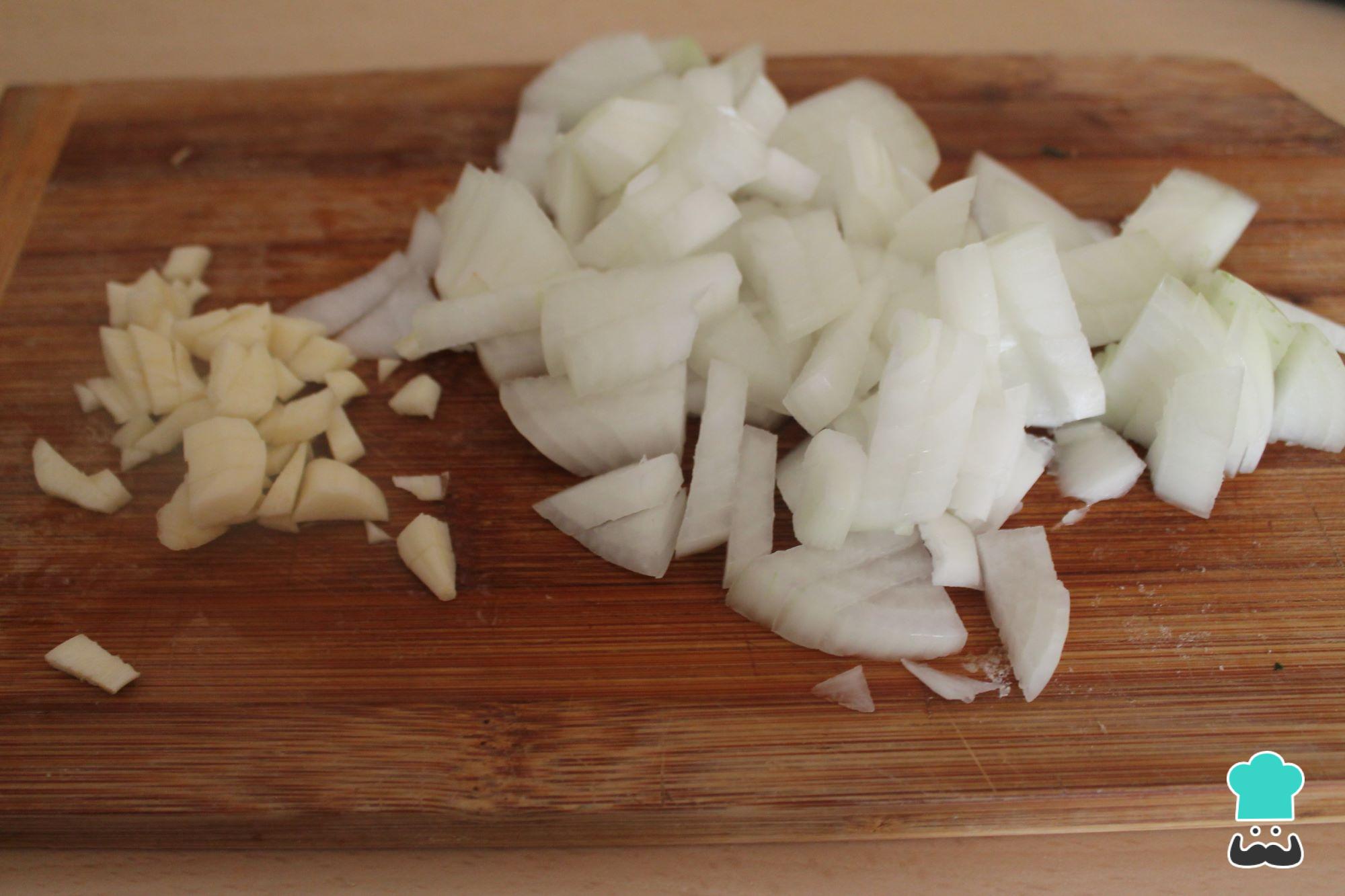 ¿Te preguntas cómo hacer salsa para las albóndigas de choco y gambas? Pues bien, te enseñamos cómo prepararla con estos pasos sencillos. Para ello, pela la cebolla y los dientes de ajo. A continuación, pícalos no muy gruesos.