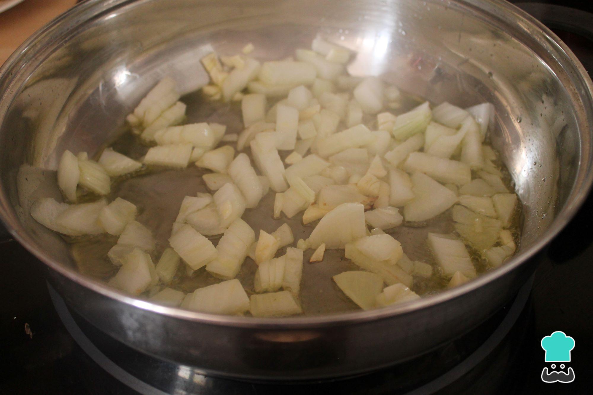 Pon el aceite de oliva en una olla amplia al fuego y, una vez esté caliente, incorpora la cebolla y los dientes de ajo picados. Déjalos pochar a fuego lento hasta que la cebolla esté transparente.