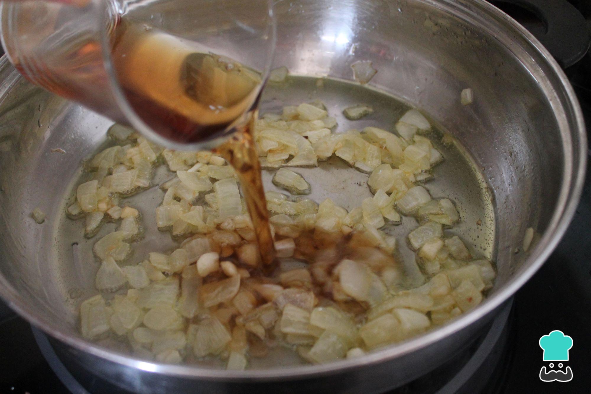 Incorpora el vino blanco, sube un poco el fuego y deja que el alcohol se evapore durante 1 minuto.
