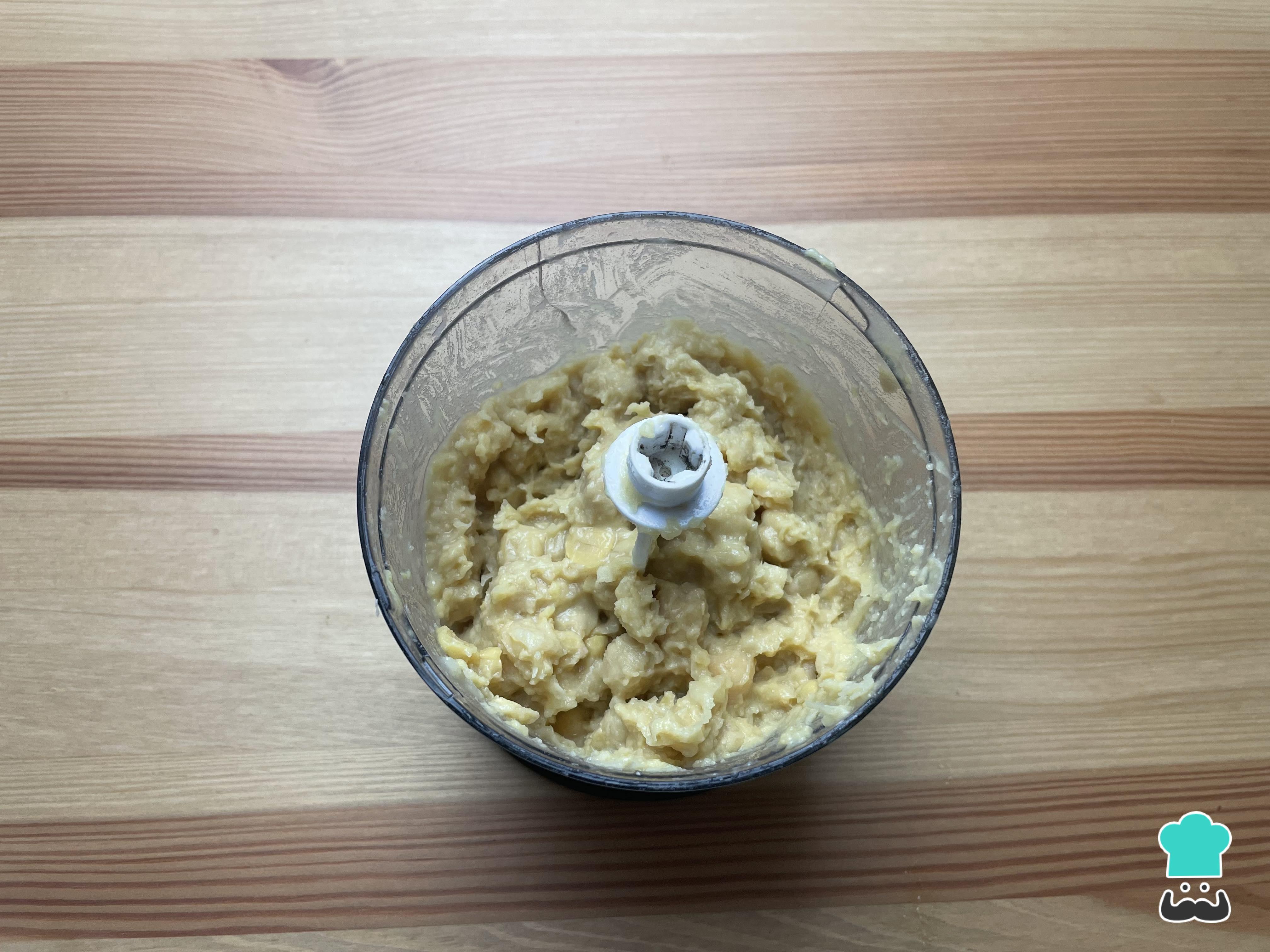 Para empezar a preparar estas deliciosas albóndigas de garbanzos comienza triturando todos los garbanzos cocidos en un procesador de alimentos hasta que obtengas una textura como la del hummus.