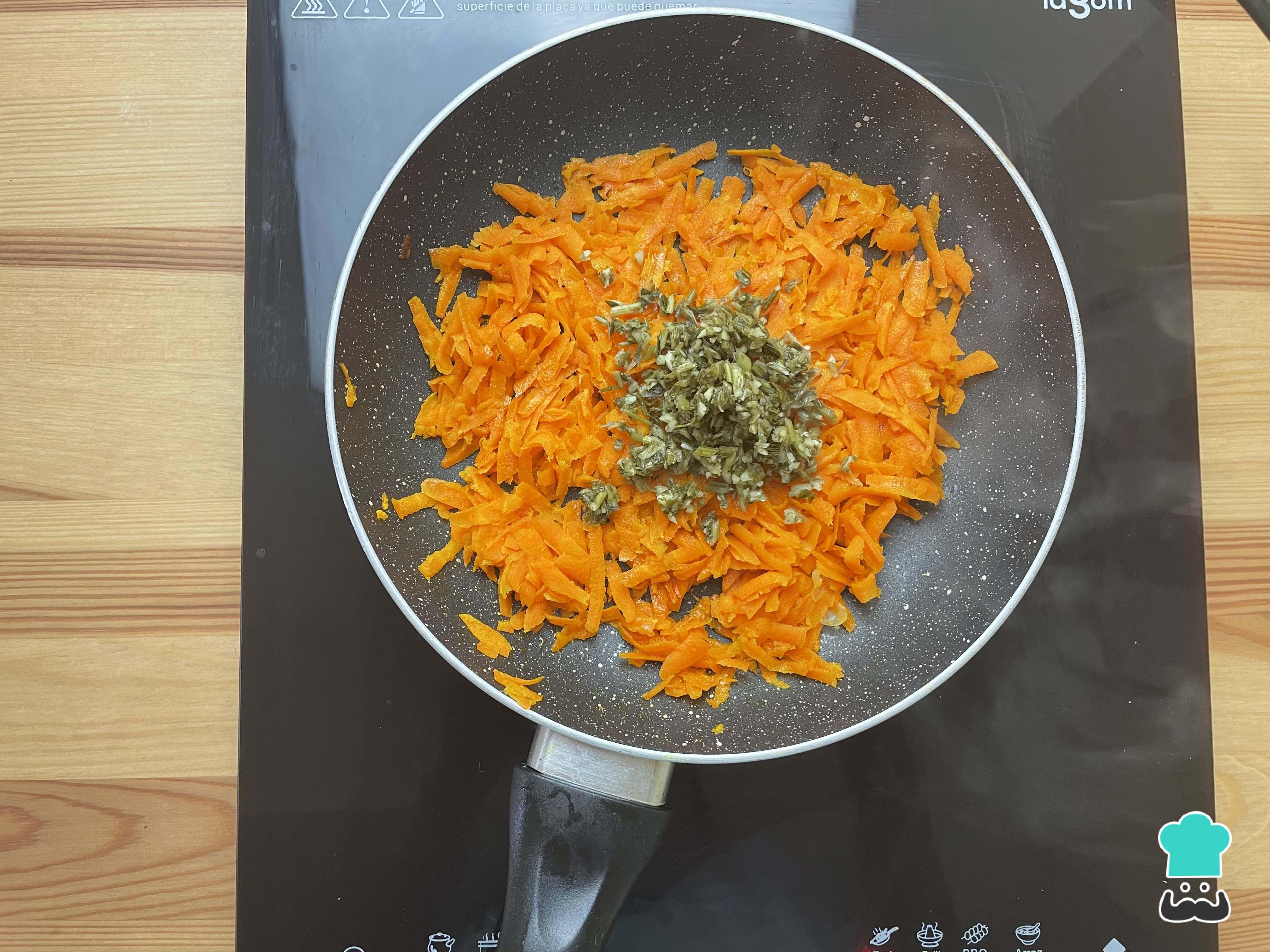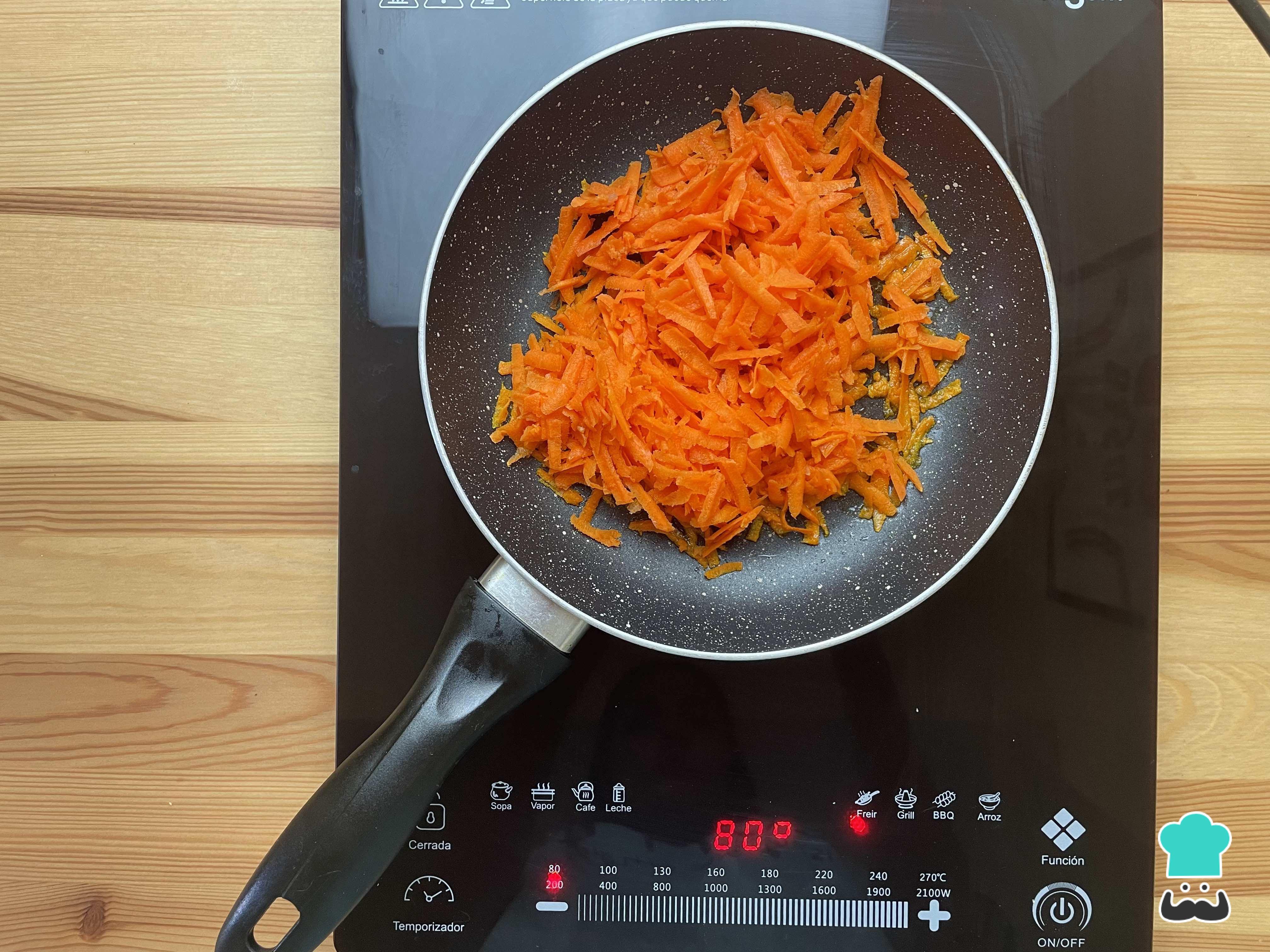 Pon una sartén a calentar, añade 2 cucharadas de aceite y vierte dentro las zanahorias ralladas. Deja que se sofrían a fuego medio bajo durante unos 5 minutos.