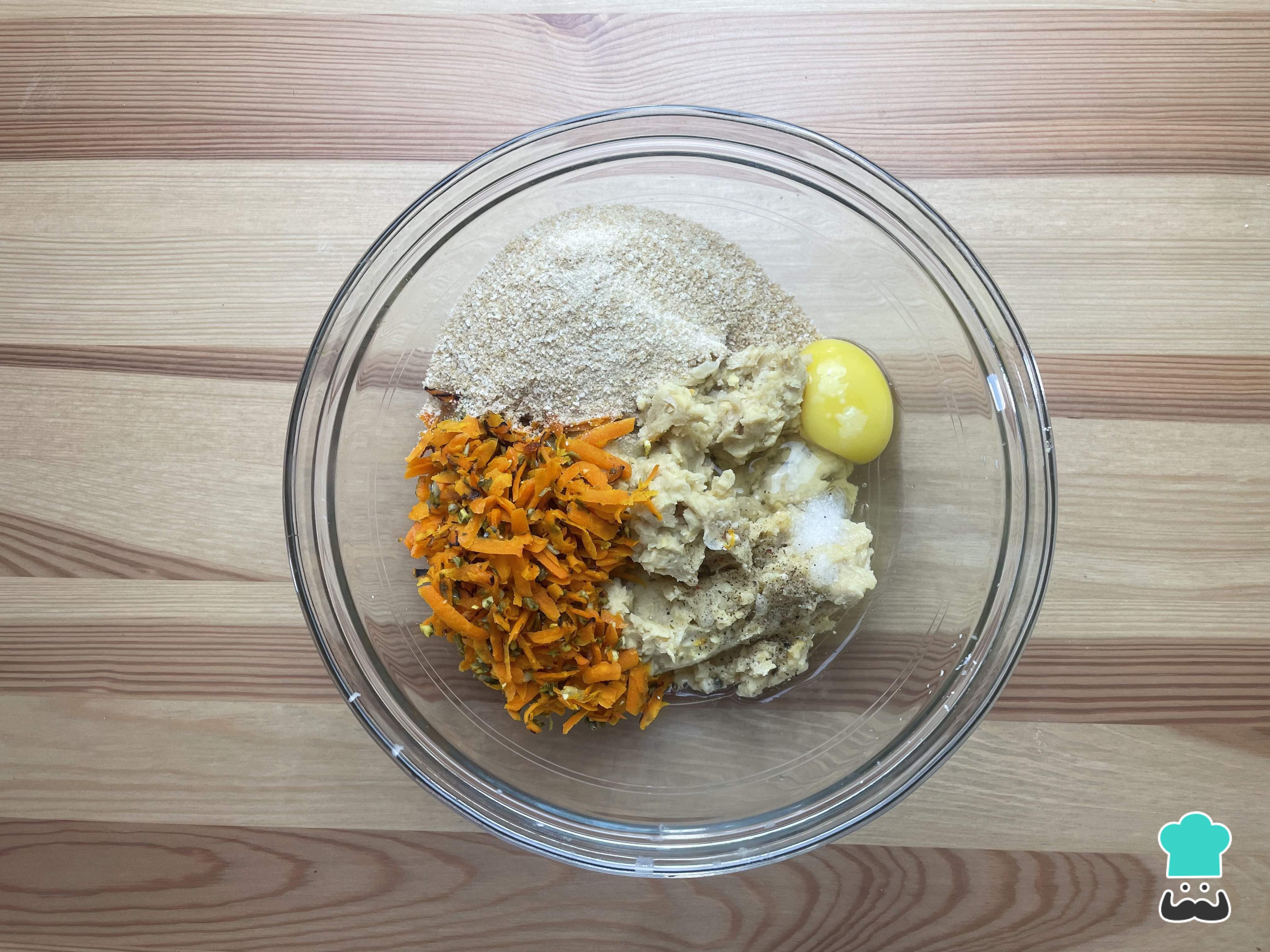 En un bol añade los garbanzos triturados, el pan rallado, el huevo, el sofrito que has preparado anteriormente, la sal y la pimienta. Mezcla todos los ingredientes con una espátula hasta que se integren completamente y quede una masa que no se pegue en las manos.