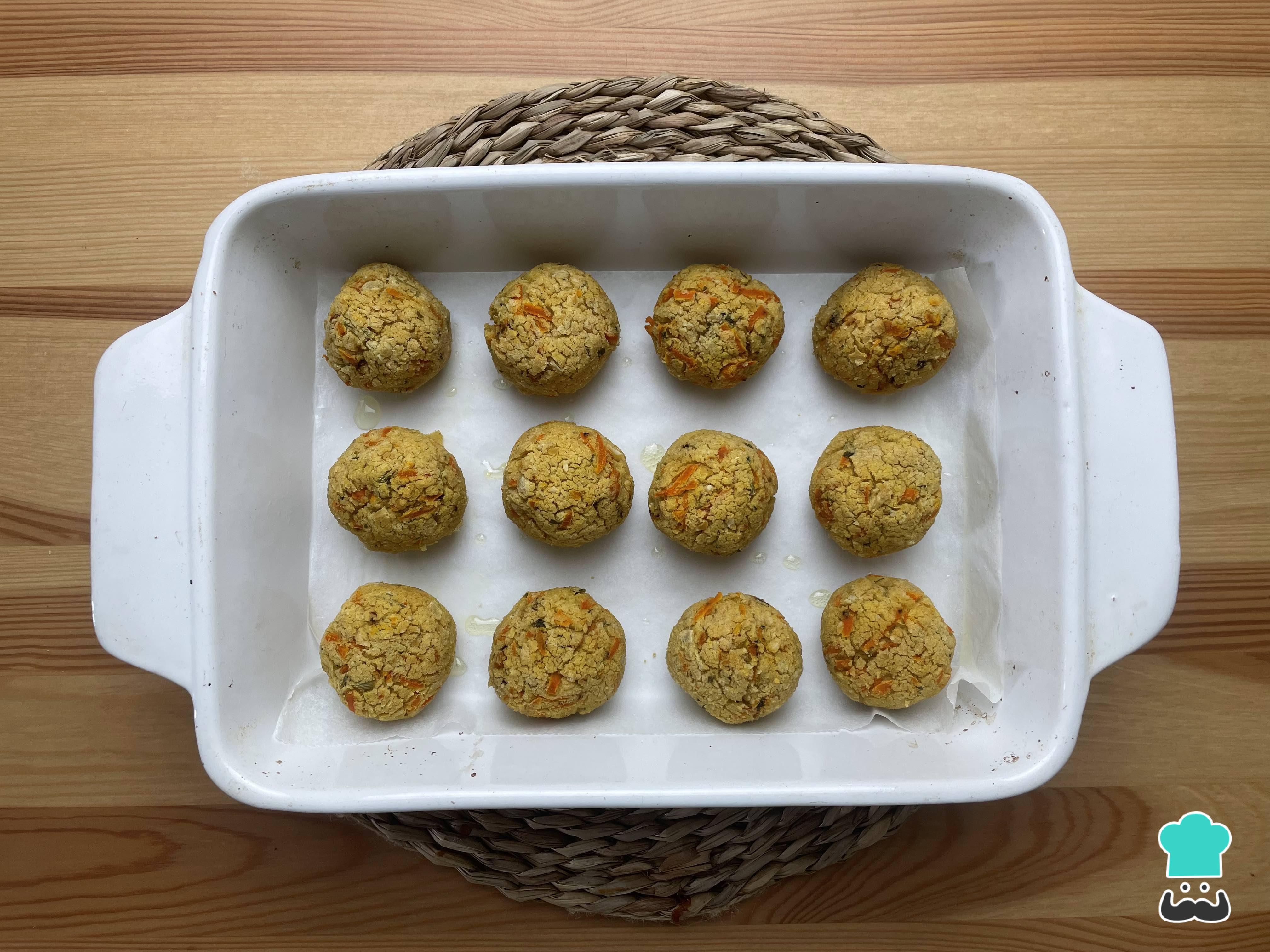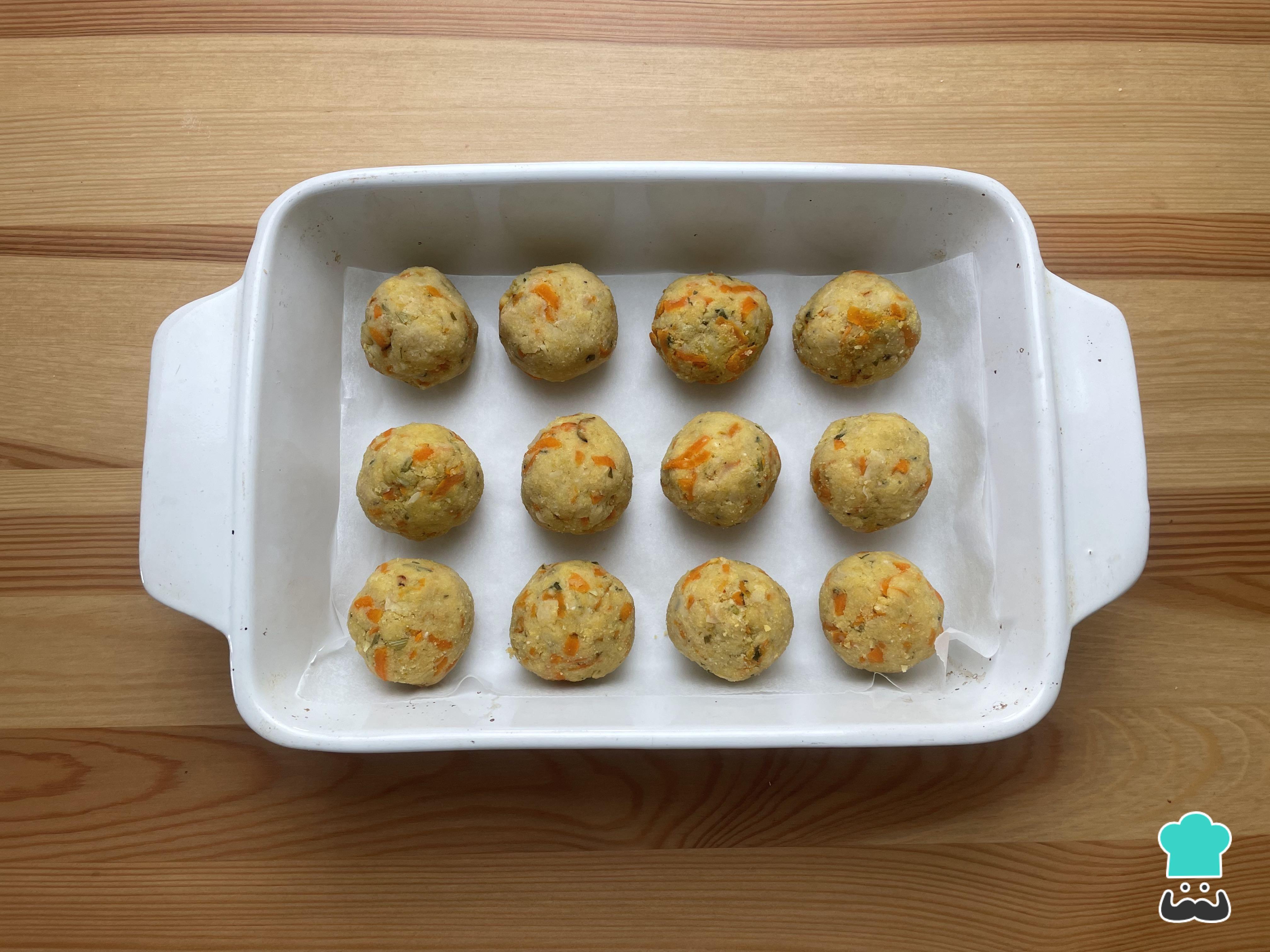 Ve formando bolitas y colócalas en una bandeja con papel de horno. Vierte por encima una cucharada de aceite de oliva y lleva al horno precalentado a 180 ºC durante unos 20 minutos.
