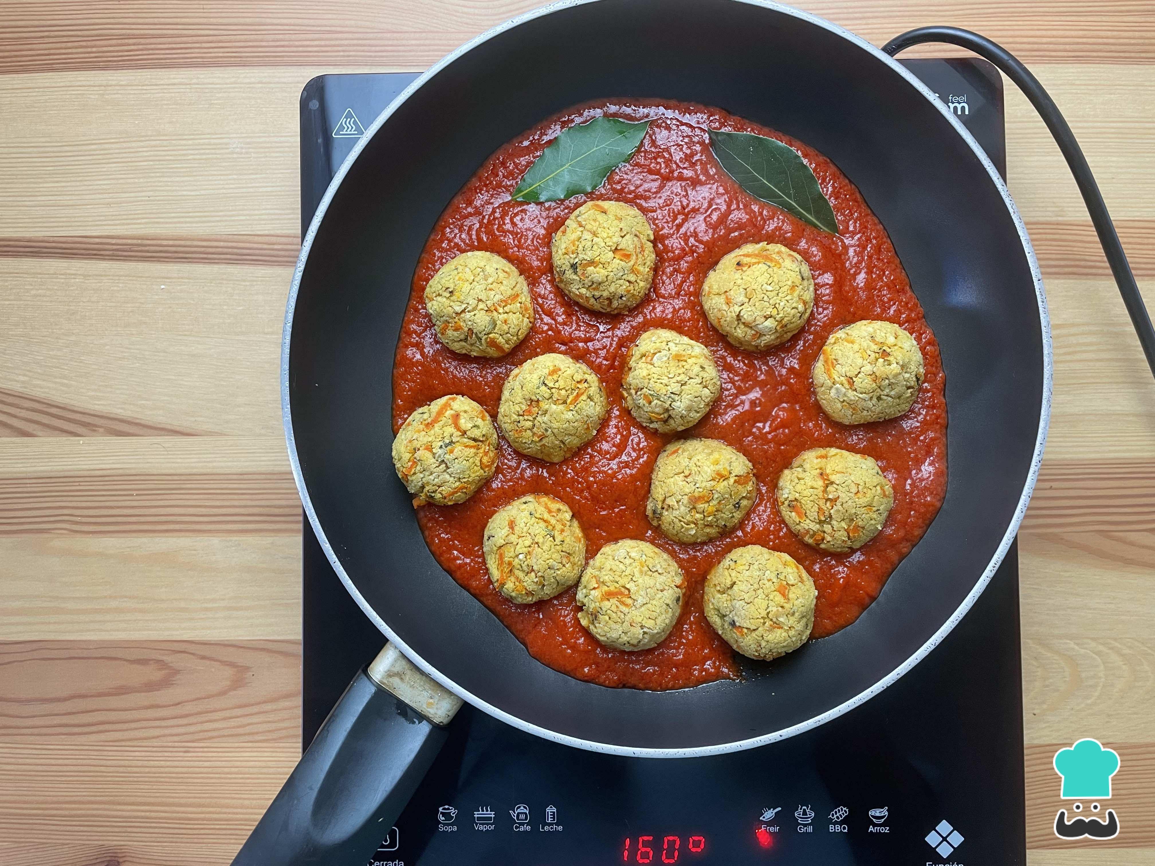 En una sartén amplia, vierte el tomate frito y añade las 2 hojas de laurel y las albóndigas. Enciende el fuego a una temperatura media y cocina durante unos 10 minutos. ¡Y ya estarán listas para servir y comer! Cuéntanos en los comentarios tu opinión y comparte con nosotros una fotografía del resultado final.