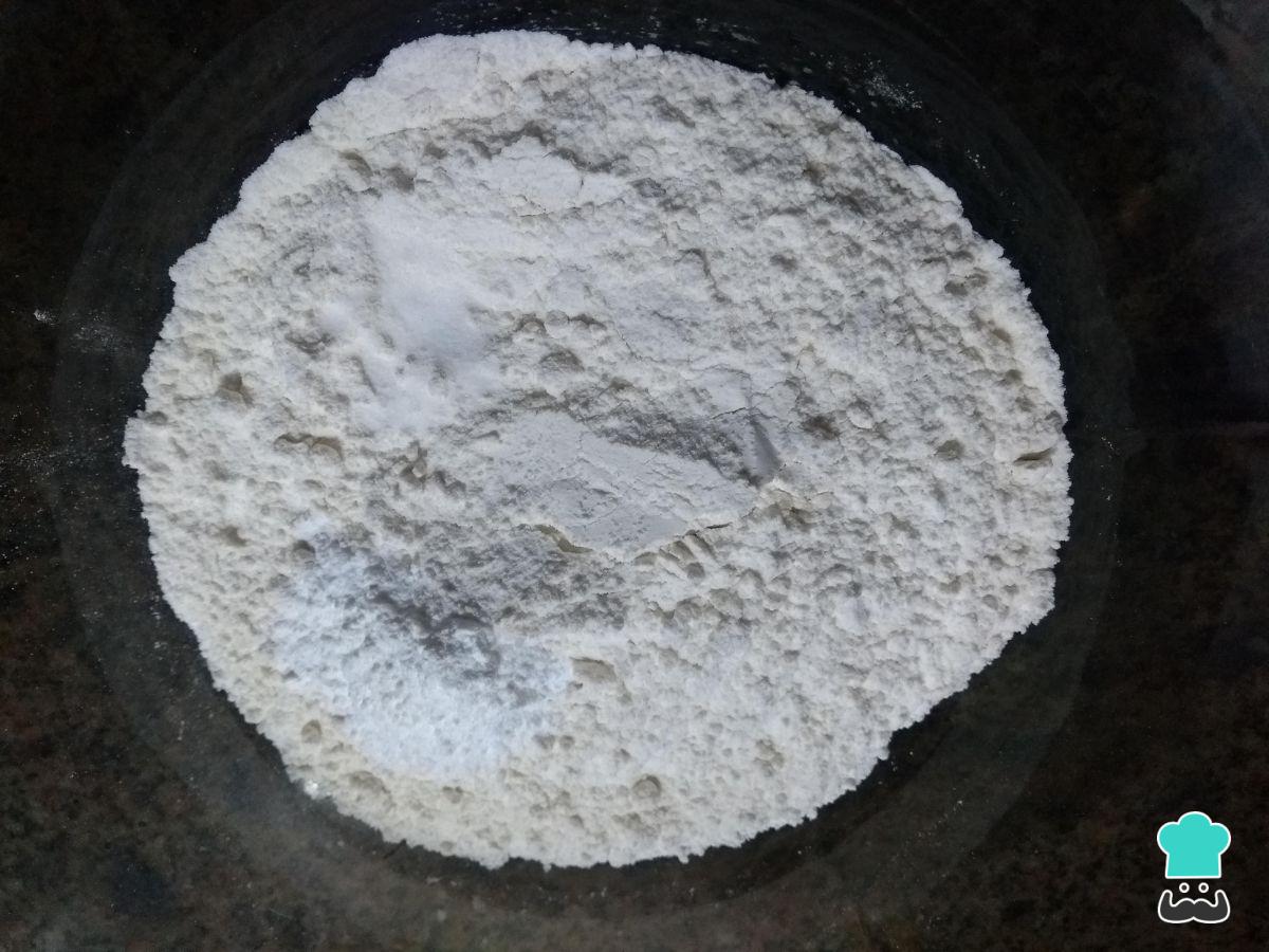 Para empezar con la receta de alfajores cordobeses, primero en un recipiente tamiza la harina y mézclala con el polvo para hornear, el bicarbonato de sodio y la pizca de sal.