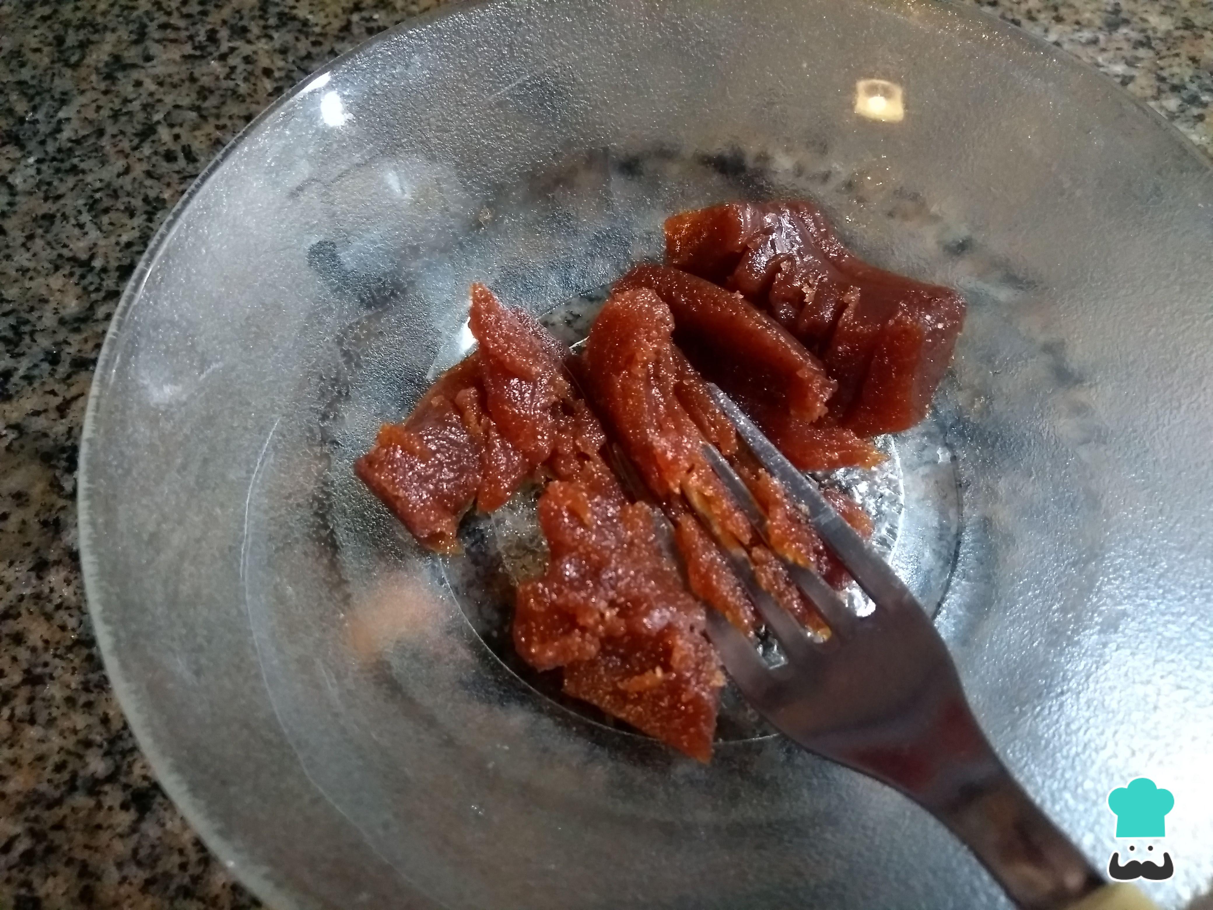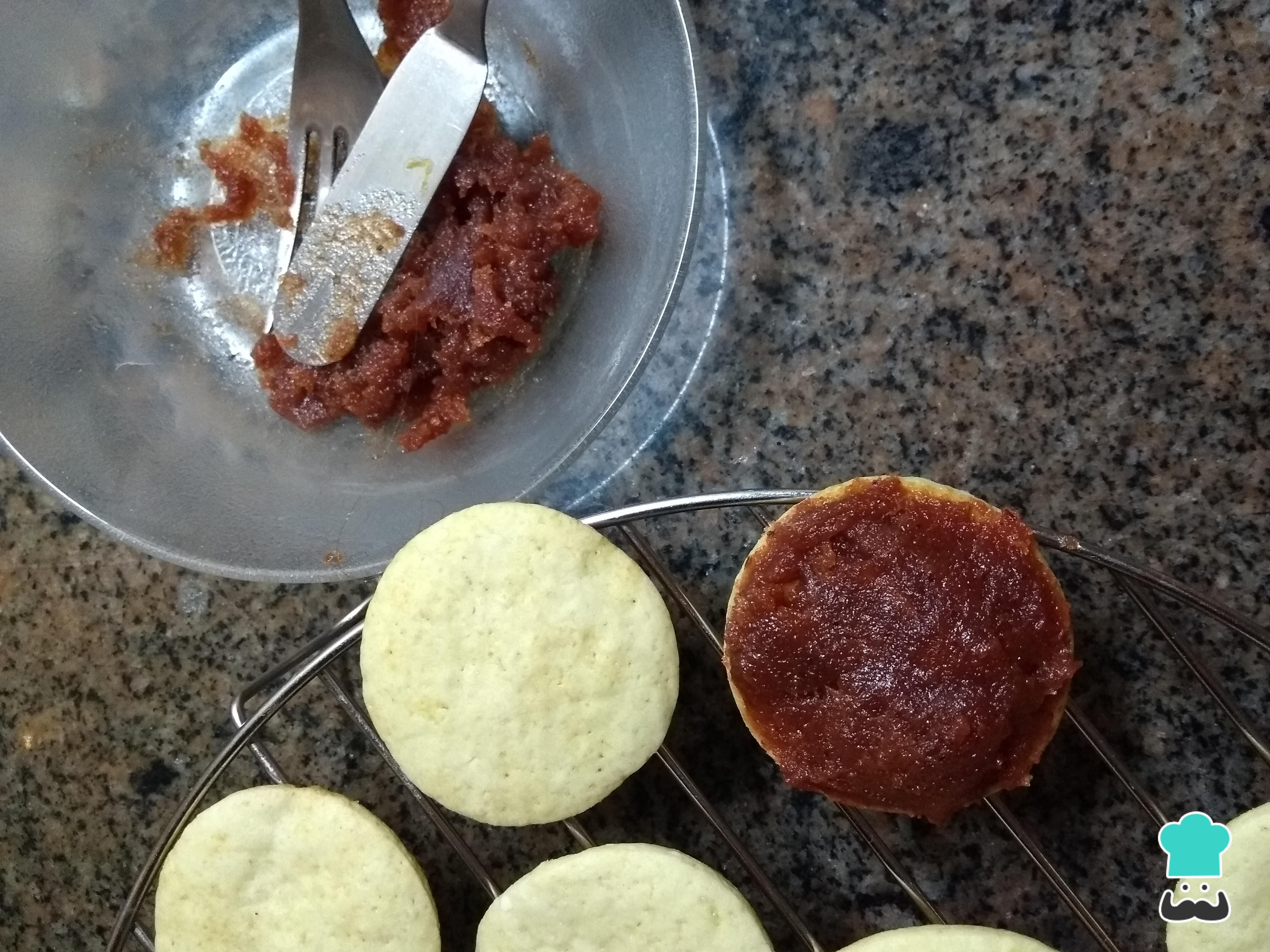 Si eliges rellenar los alfajores con dulce de membrillo, primero coloca el dulce en un recipiente y písalo con un tenedor para ablandarlo, así tomará una consistencia más cremosa.