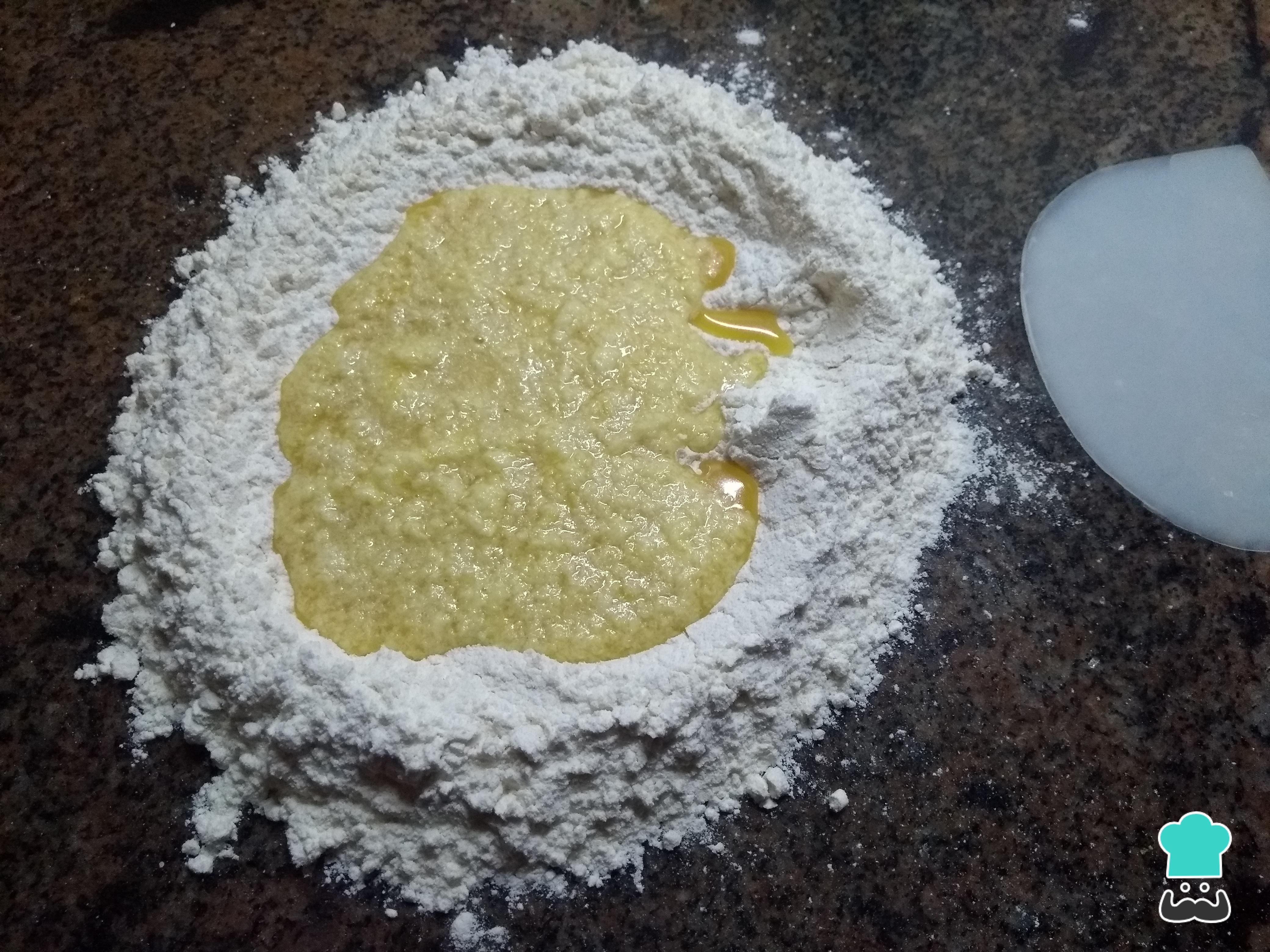 Realiza una corona en la mesada con la harina y con el resto de los ingredientes secos que integramos en el primer paso. Seguido, coloca el batido líquido en el centro.