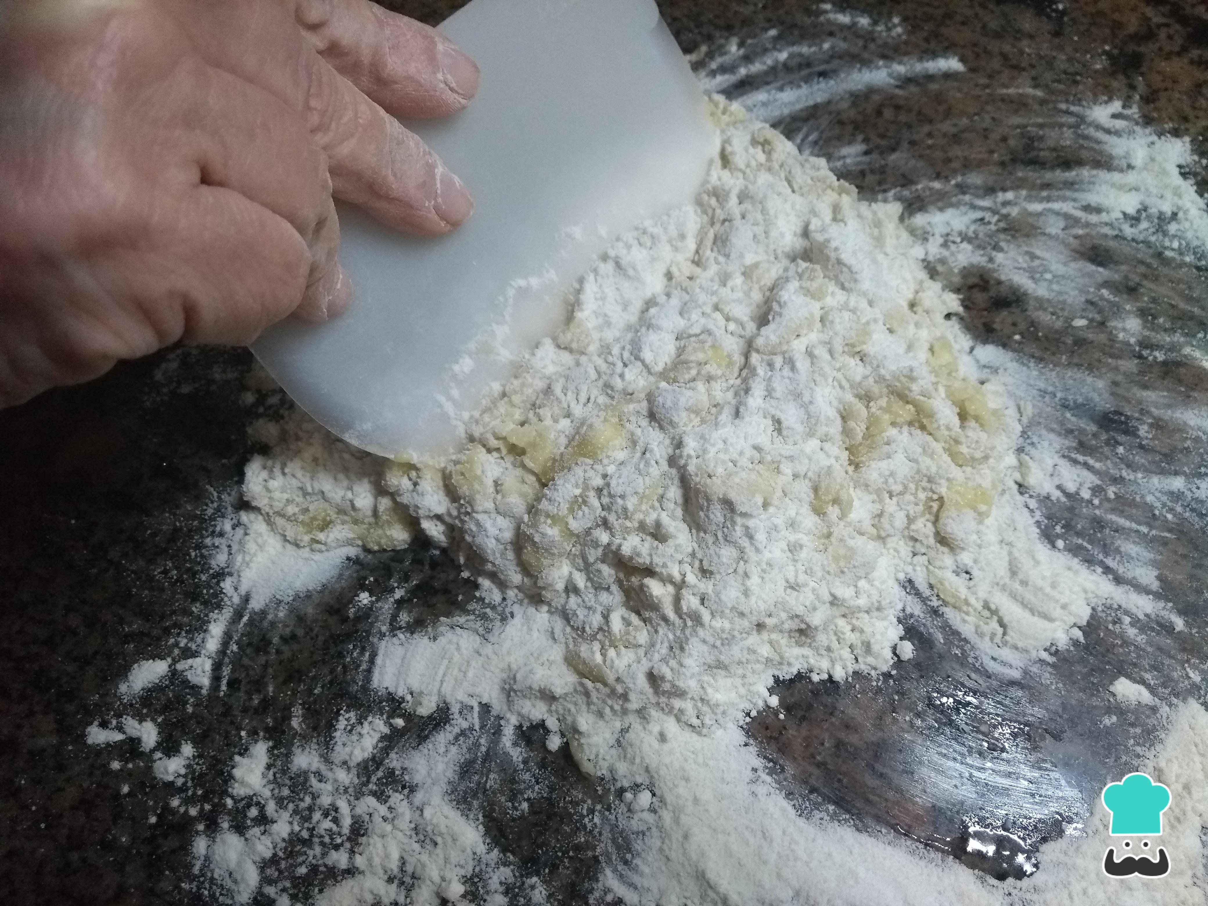 Comienza a unir sin amasar. Puedes ayudarte con un cornet o espátula para manipular la masa lo menos posible.