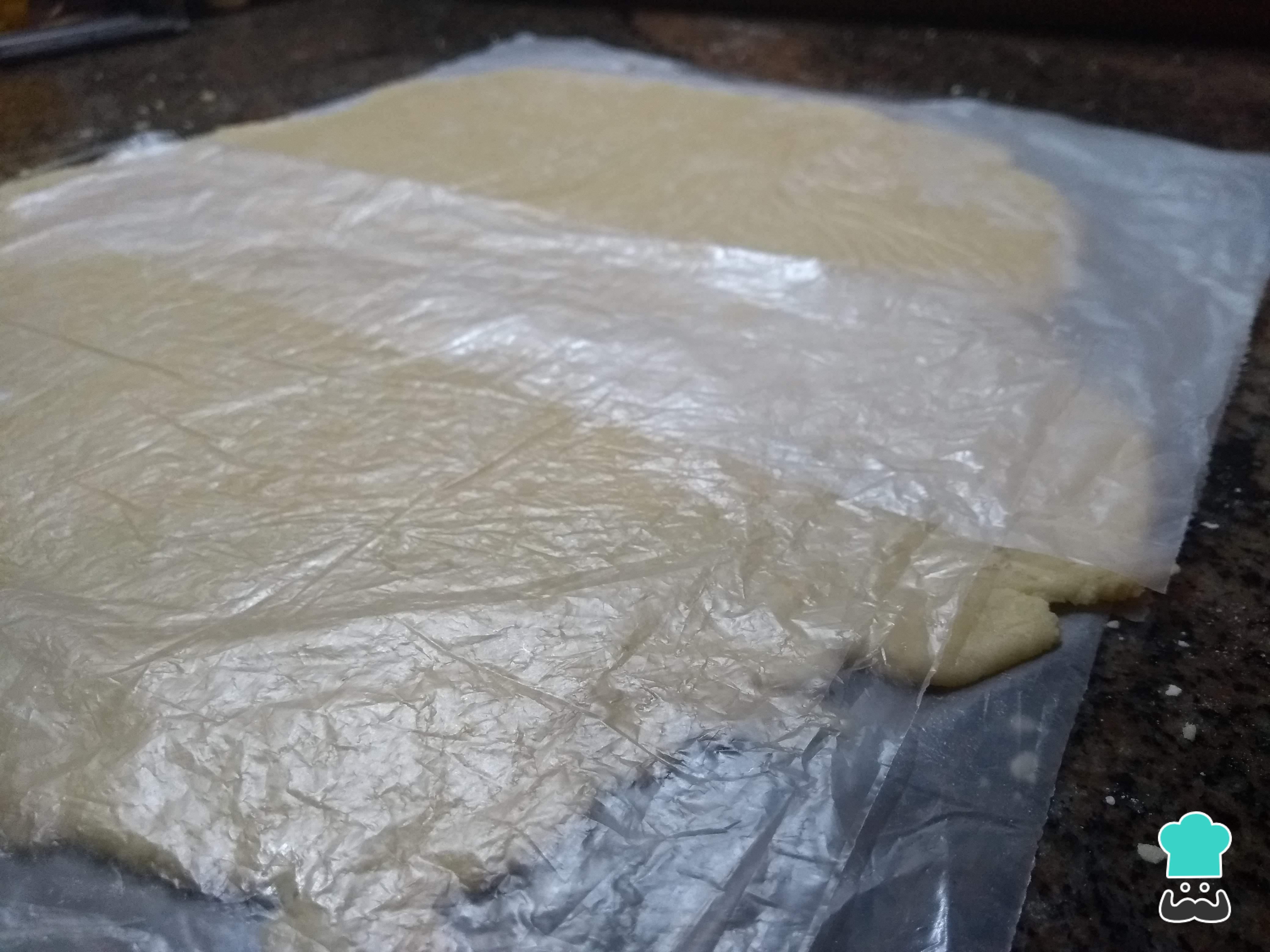 Coloca la masa obtenida sobre papel film o separadores y estírala con palo de amasar hasta que quede aproximadamente 4 mm de espesor. Luego, coloca sobre una placa y llévala a la heladera durante al menos 30 minutos o hasta que quede bastante dura.