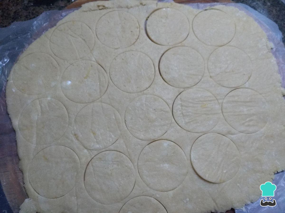 Cuando la masa se haya enfriado, retírala de la heladera y corta los discos con un cortante circular de 5 cm de diámetro. Encima coloca los recortes sobrantes y vuelve a estirar para continuar cortando discos, aprovechando la masa todo lo que puedas (recuerda no amasar). Si la masa ya no está fría, déjala descansar nuevamente en la heladera antes de seguir cortando.