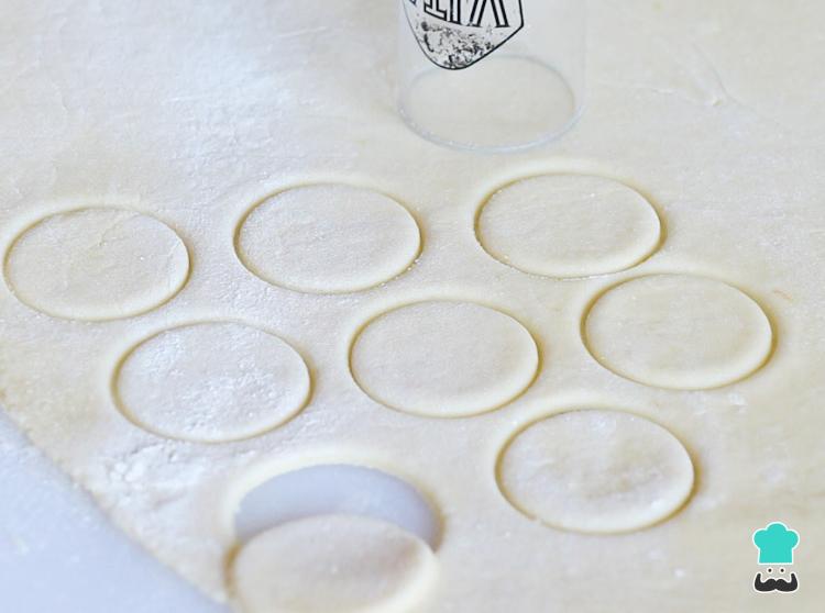 Cuando tengas una masa consistente y sin grumos, extiéndela con un rodillo dejando 0.5 cm de grosor. Para hacer los alfajores de maicena argentinos corta círculos de unos 4 centímetros de diámetro y colócalos sobre una bandeja de horno previamente enharinada. Precalienta el horno a 180ºC.