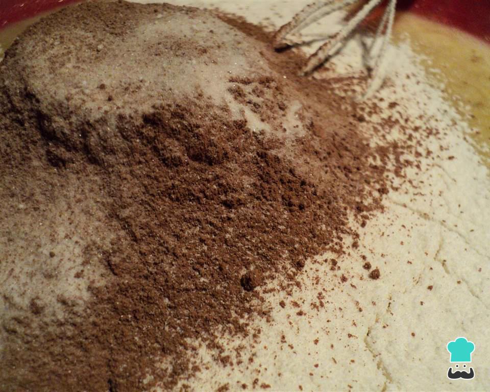 Ahora vamos a realizar los alfajores de chocolate. De esta forma obtendrás dos tipos distintos de este dulce argentino. Coge otro recipiente y ralla el chocolate, otra opción es utilizar cacao en polvo. Agrega la harina previamente tamizada junto con el bicarbonato y los polvos de hornear y mézclalo todo. Luego, incorpora el azúcar glass, las yemas y la manteca derretida y sigue batiendo.