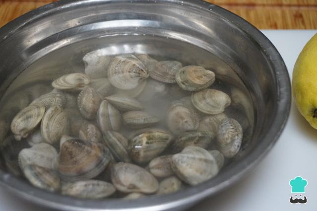 Ponemos las almejas en un bol con abundante agua y sal y las dejamos unos 30-40 minutos. Reservamos el bol en la nevera para que no se estropeen las almejas. Como decíamos, este paso es importante para retirar la arena que pueda quedar.