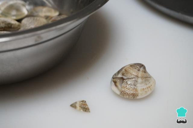 Pasado este tiempo, quitamos el agua y enjuagamos bien las almejas bajo el grifo. En este paso miraremos las que estén rotas para retirar los trozos de cáscara.