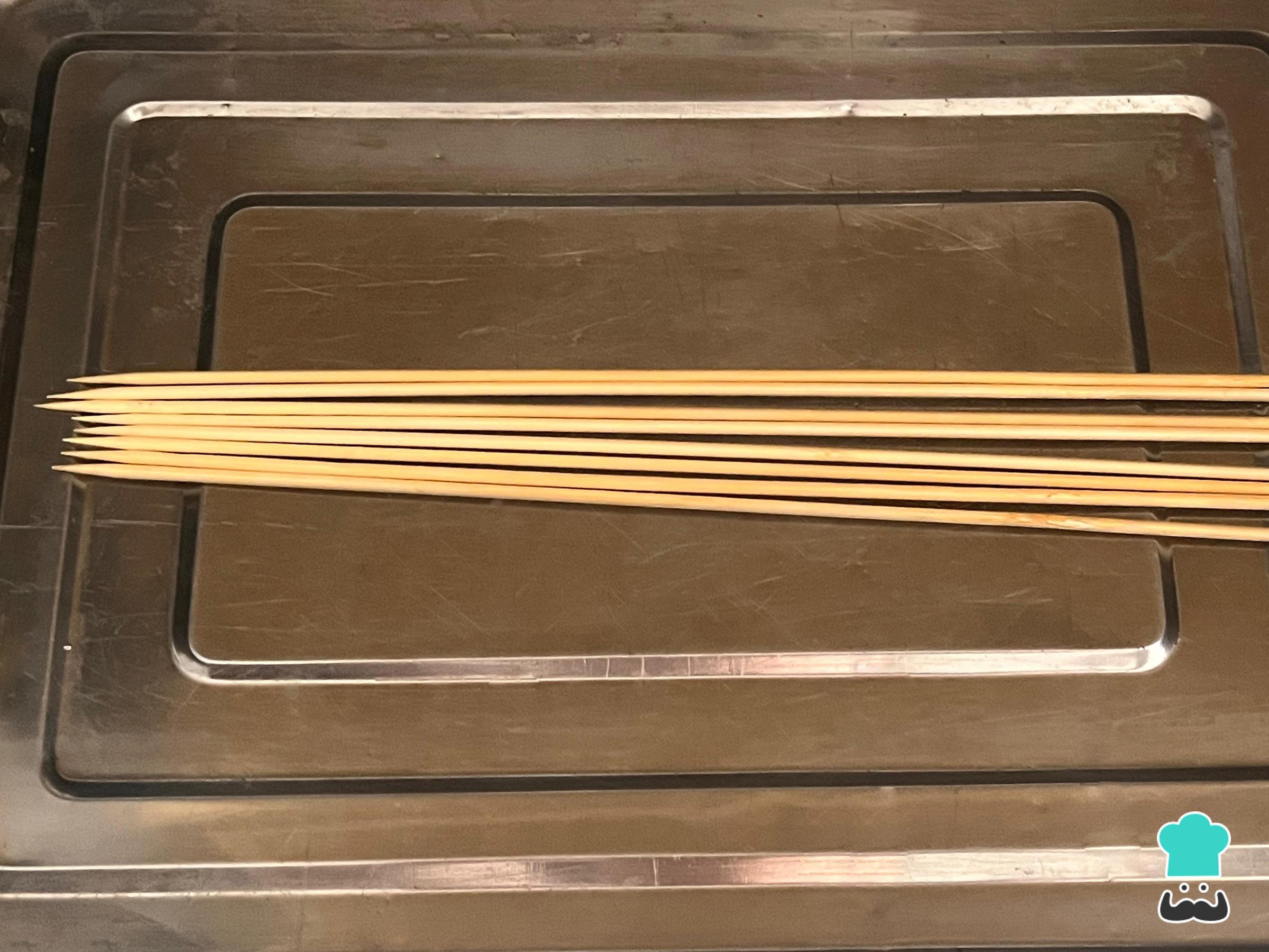 Pon los palitos para los anticuchos en remojo con agua por 30 minutos aproximadamente, esto evitará que se quemen al momento de ponerlos en la parrilla.