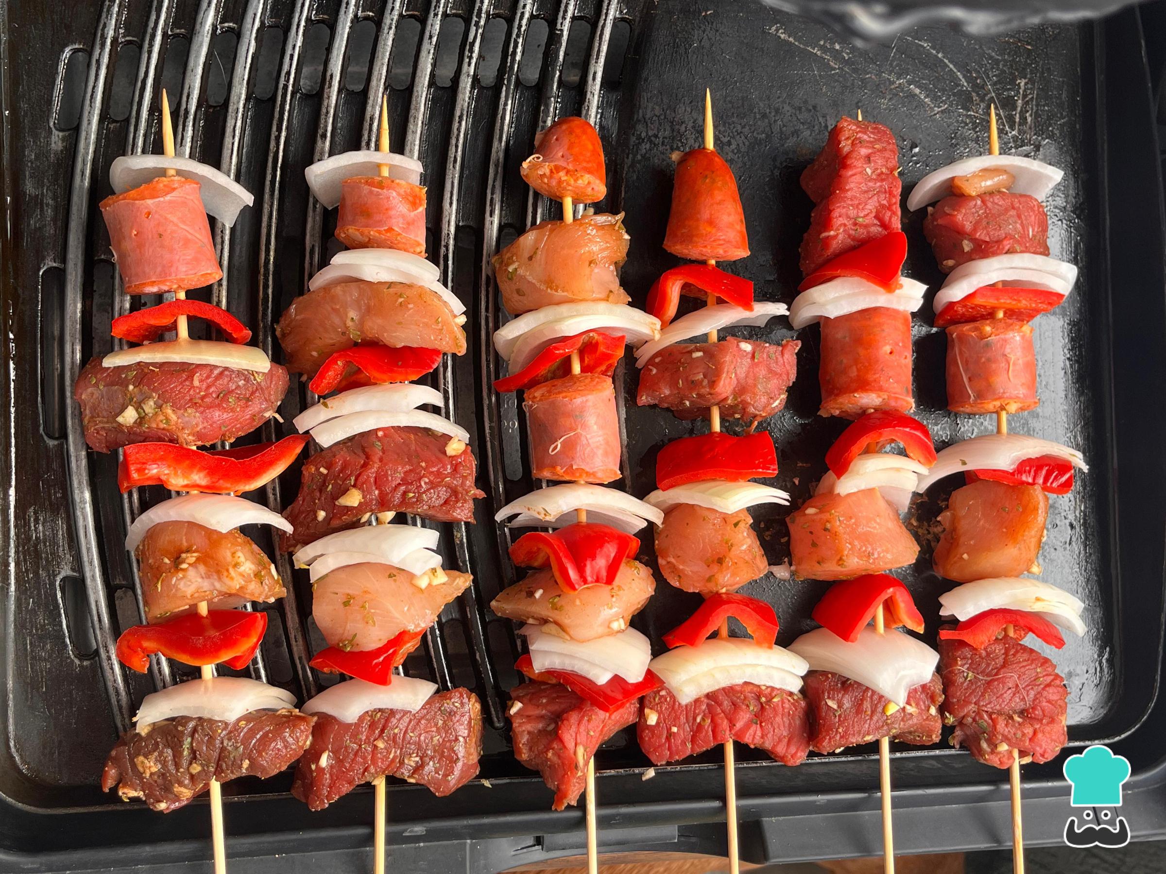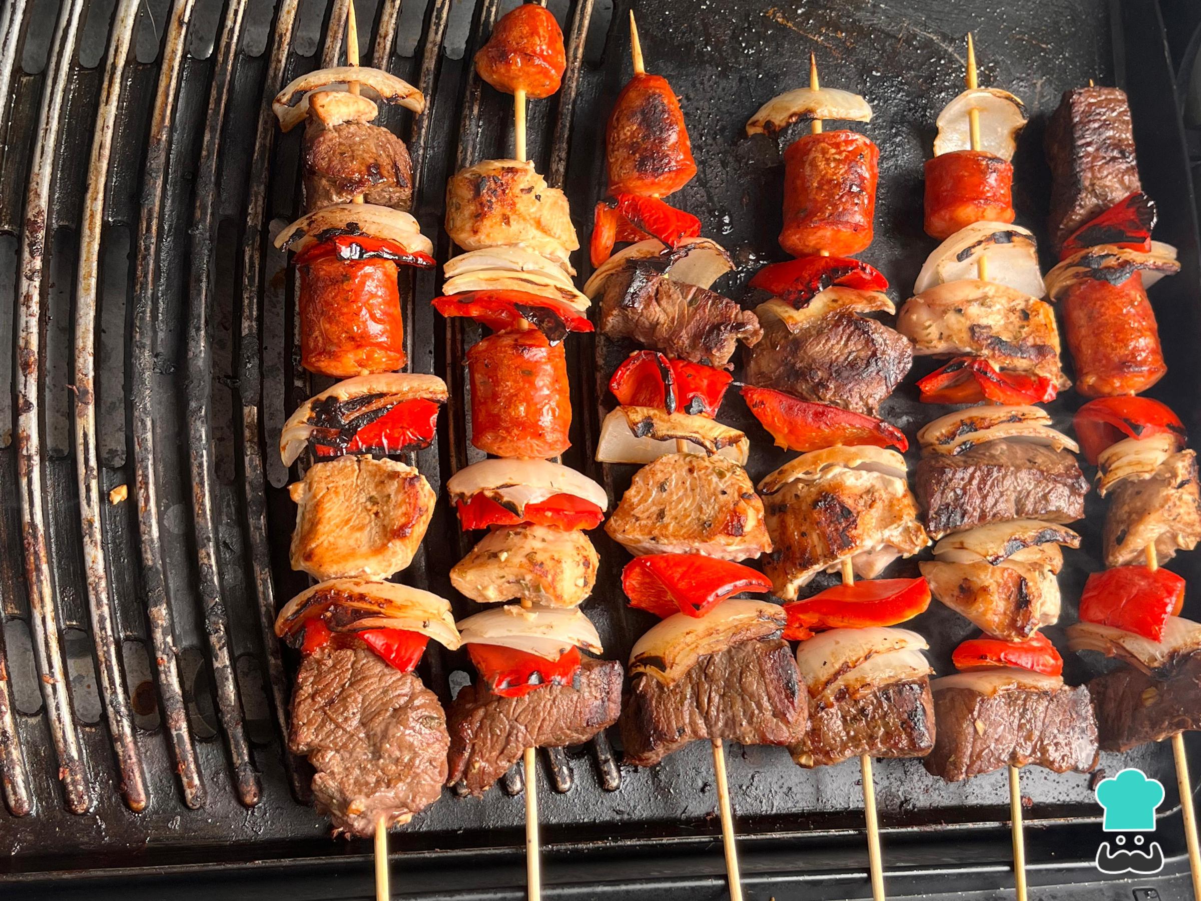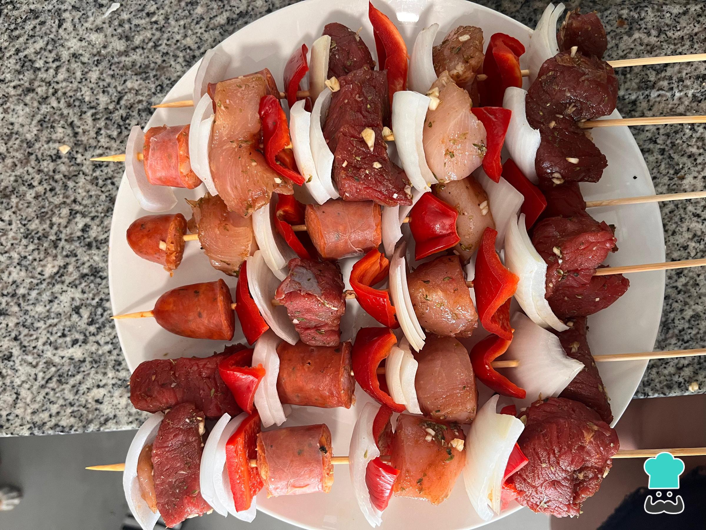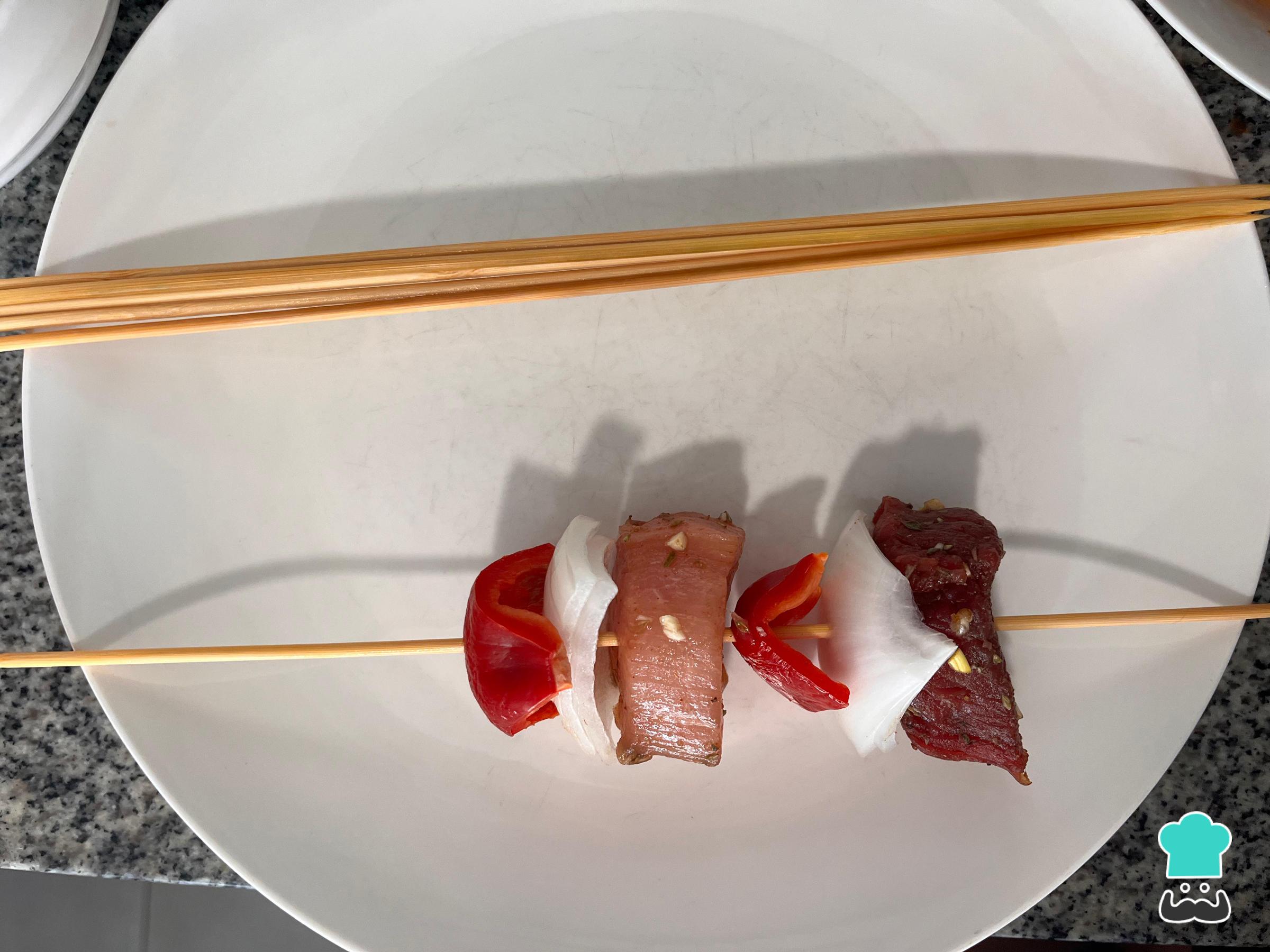 Repite el mismo proceso hasta llenar el palillo completamente, alternando entre carne, pollo, longanizas y vegetales.