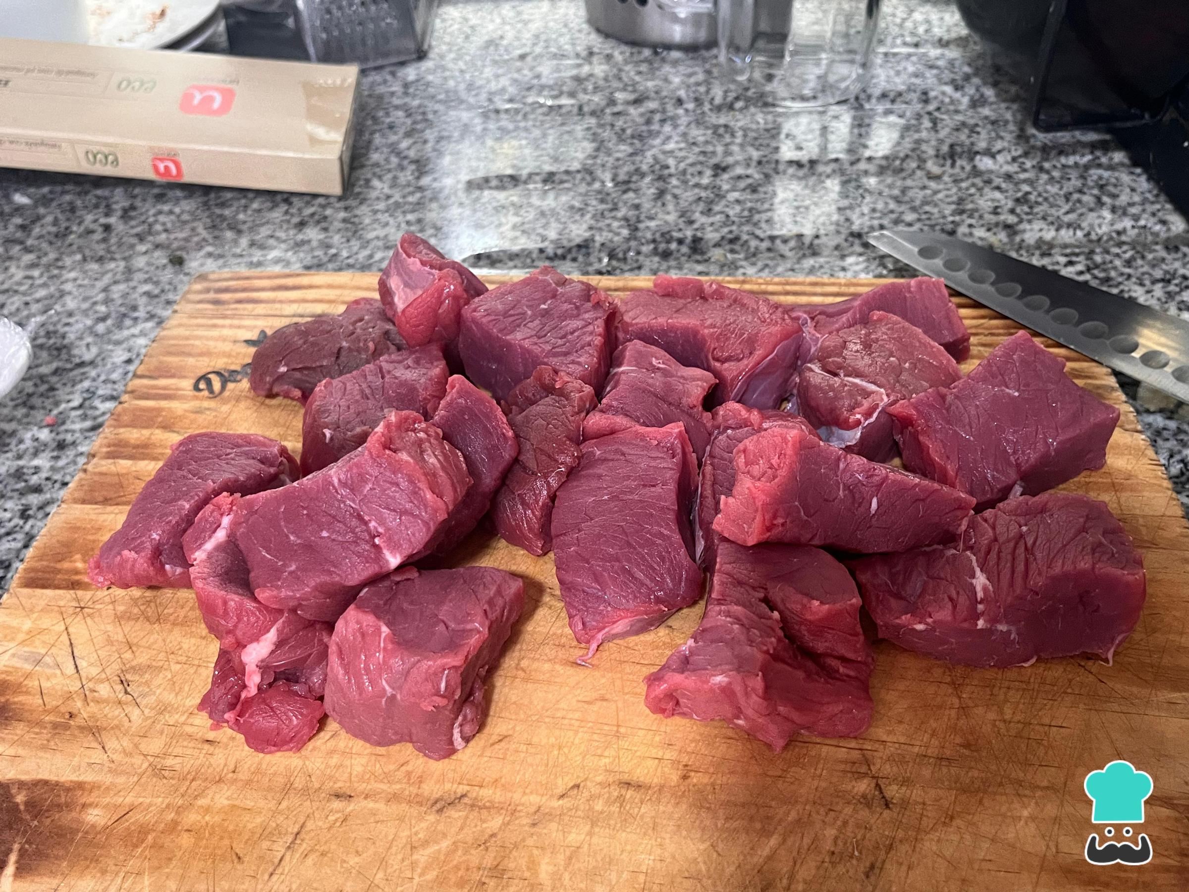 Corta la carne en cubos de 2 cm por 2 cm aproximadamente.