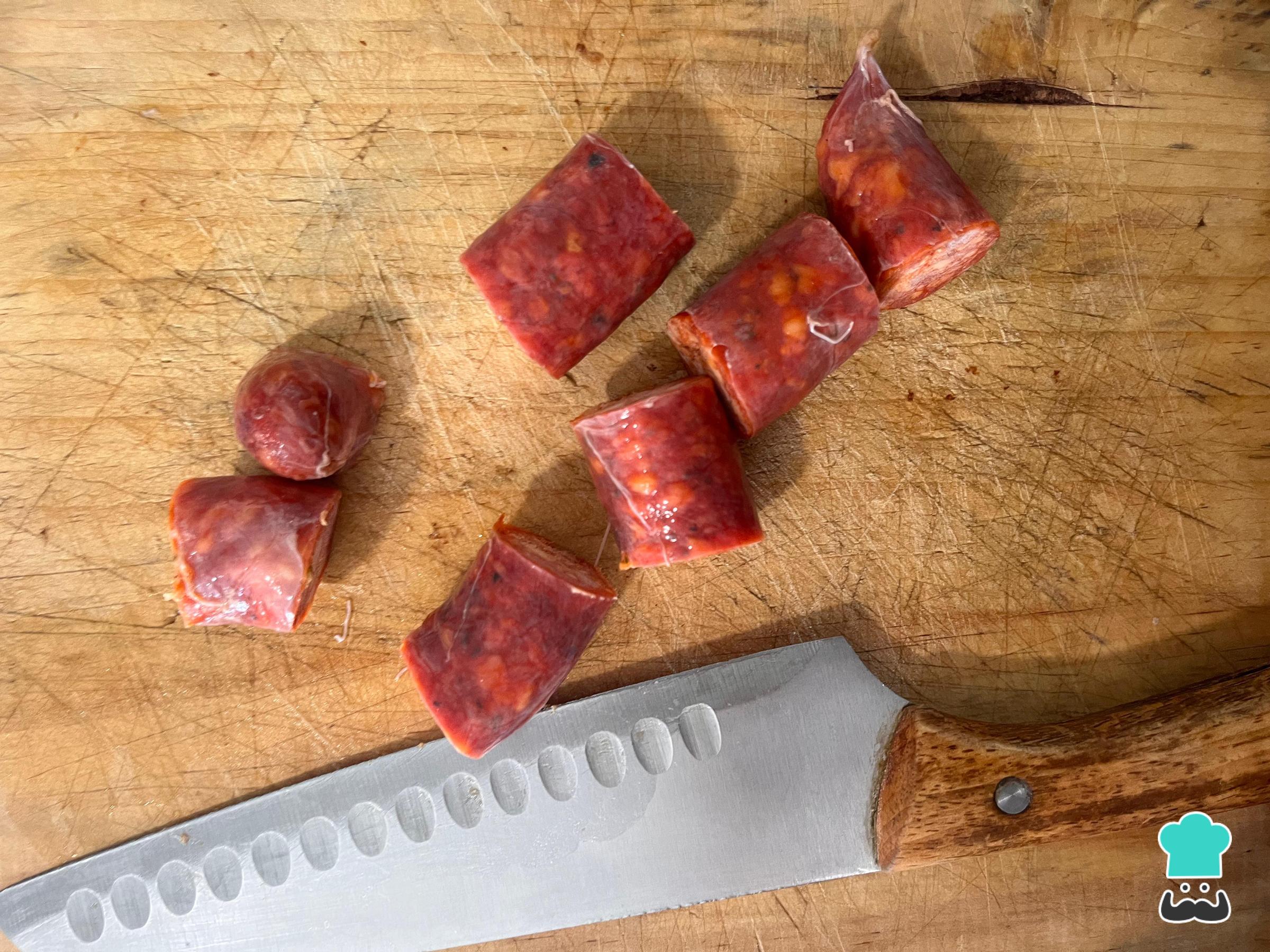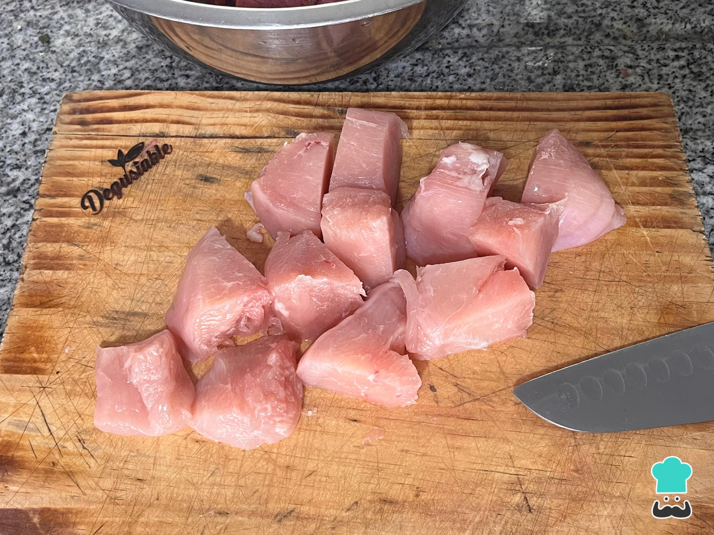 Repite el mismo proceso con el pollo, córtalo en cubos.