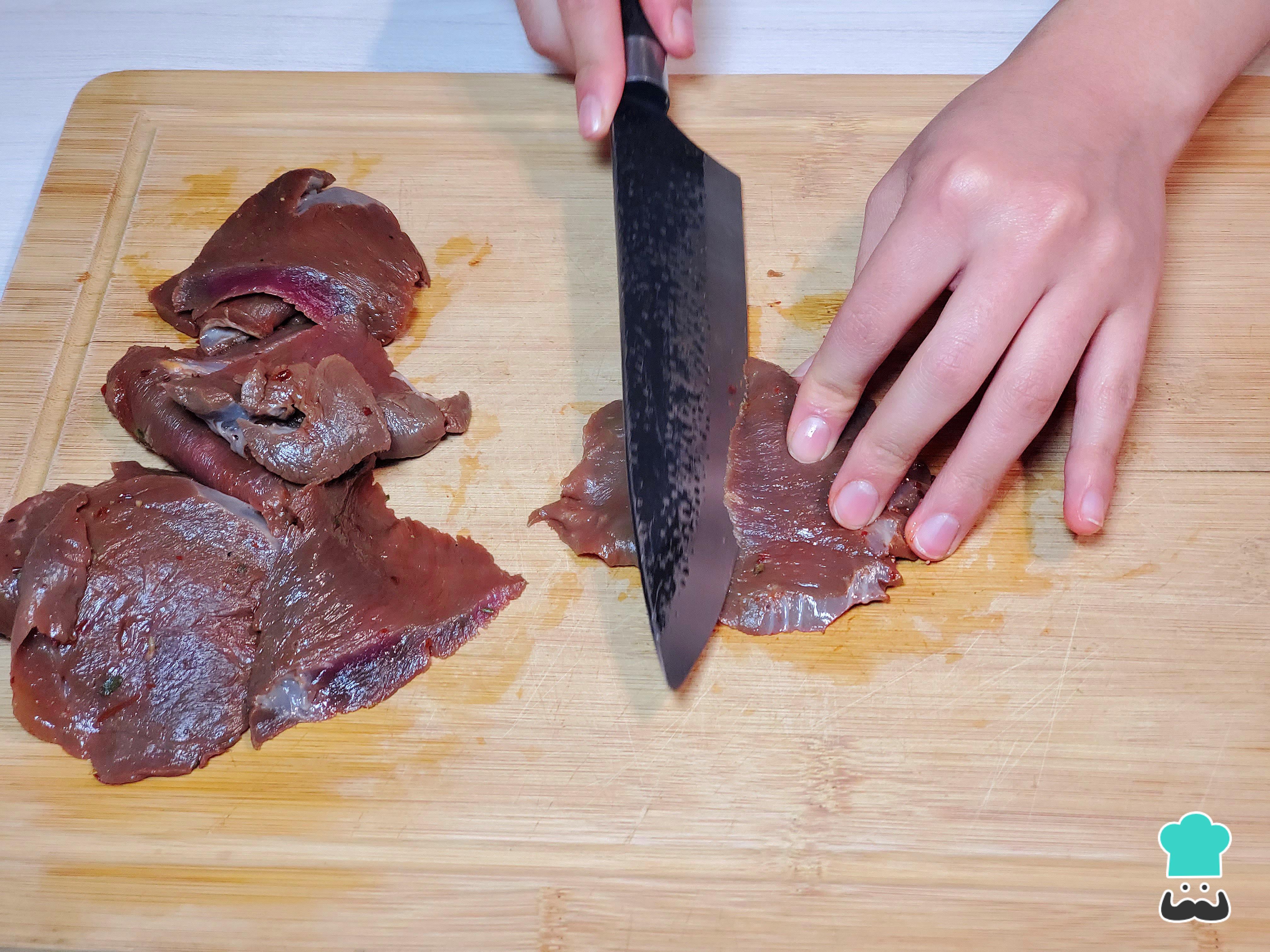 Empieza limpiando el corazón de todas las partes blancas y duras, si es que no lo compraste ya limpio. Después, procede a cortar tiras gruesas y, luego, trozos en forma cuadrada alargada y de un grosor regular para que la cocción sea pareja. Recuerda cortar a contrapelo para que quede suave.