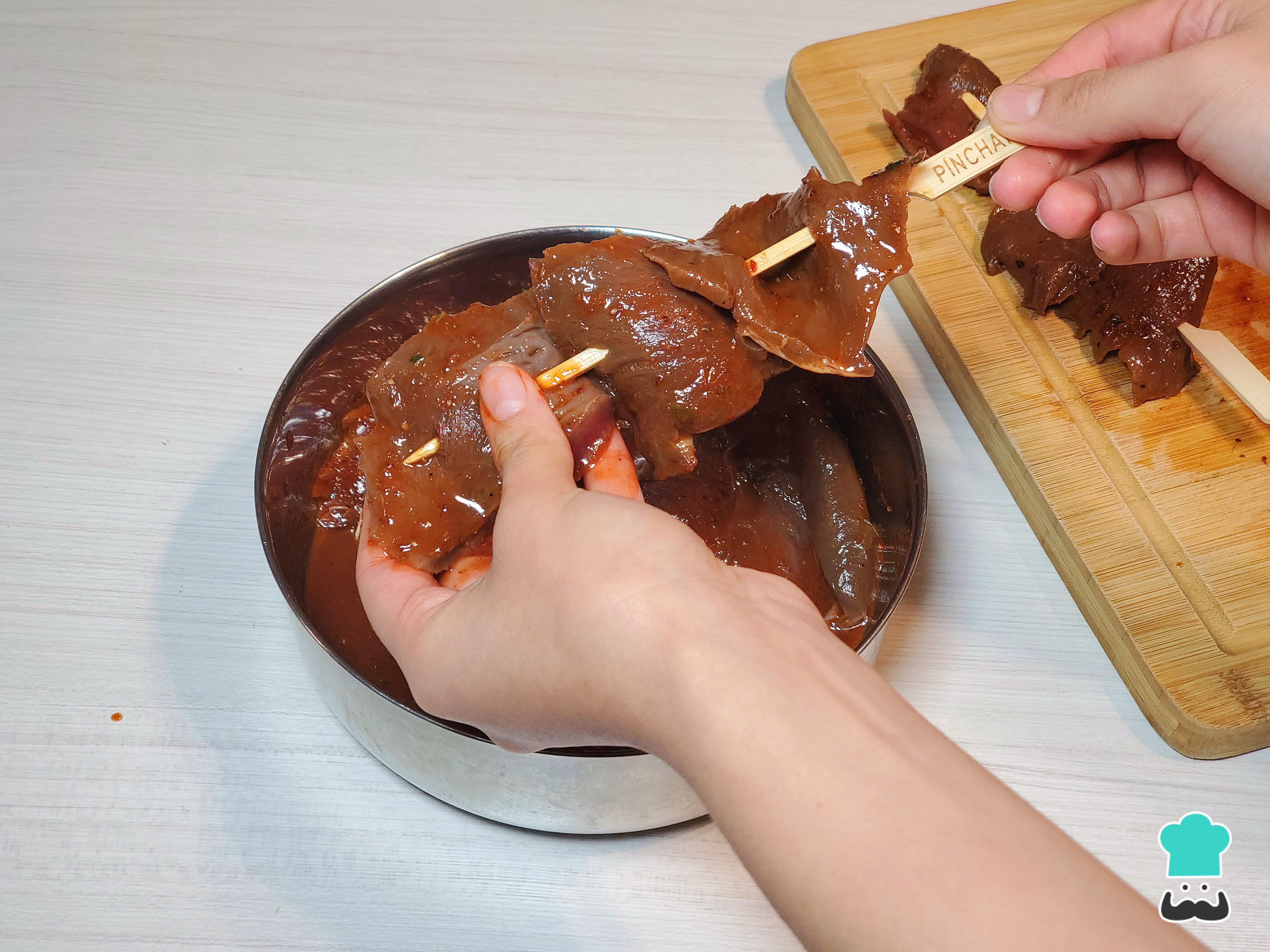 Al día siguiente, retira los trozos de corazón y colócalos en brochetas o en palitos de madera. Inserta de 4 a 5 piezas de carne en cada uno.