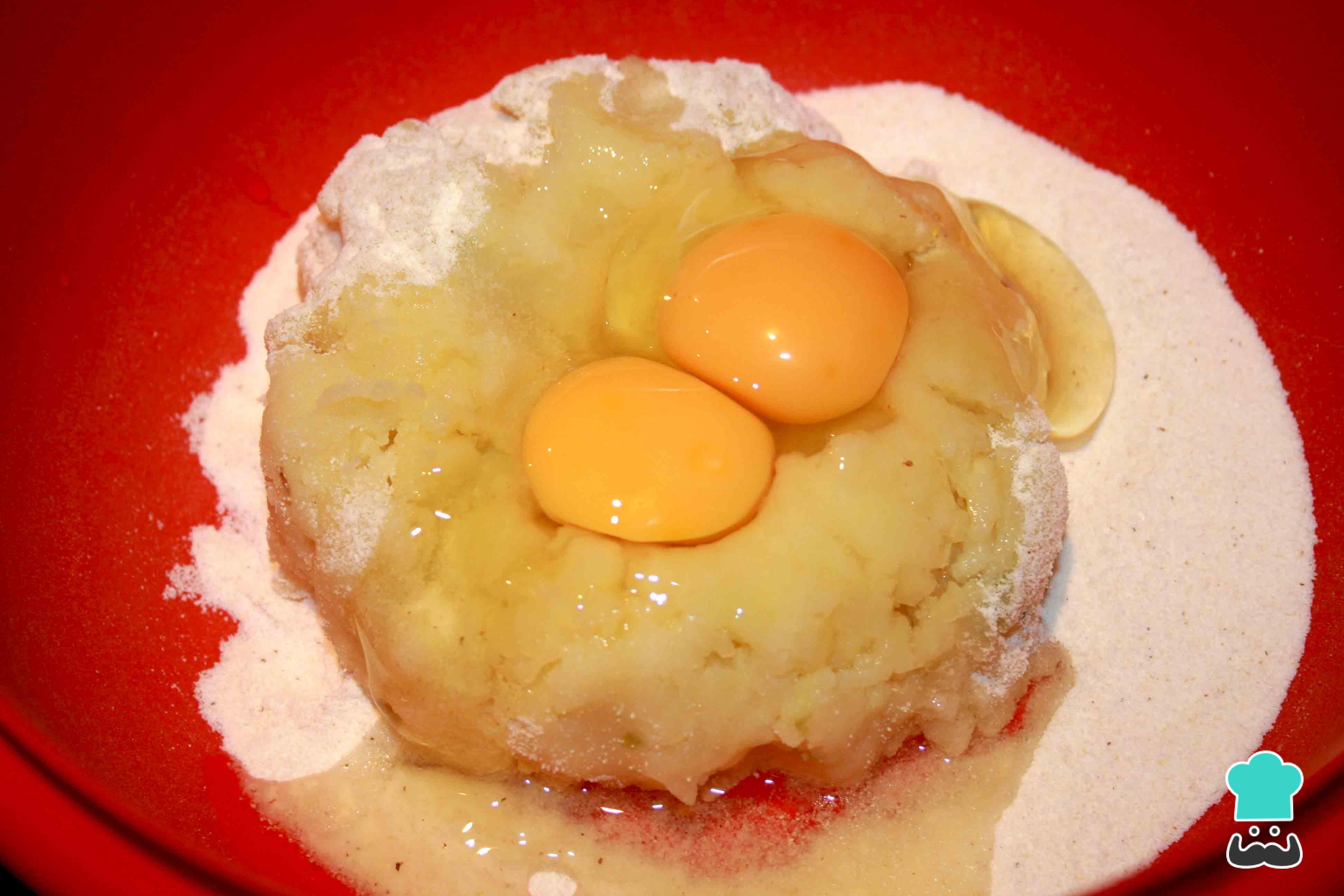 Dentro de un bol, deposita todos los ingredientes y comienza amasar. Este es el segundo paso más importante de esta recta, después del puré. Amasa hasta que no quede ningún grumo y obtengas una masa compacta.