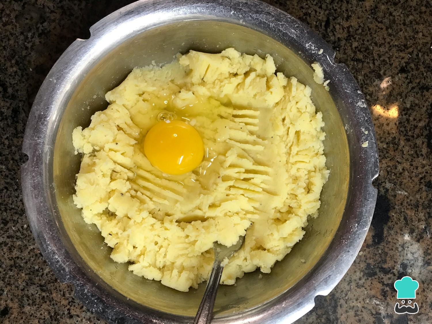 Cuando el sabor del puré esté a tu gusto, deja que se entibie un poco y agrega el huevo. Mezcla y reserva para seguir con la receta de arrollado de papa.