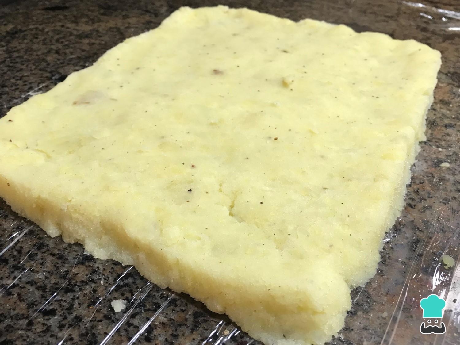 Cubre la mesa con papel film y distribuye sobre él el puré formando un rectángulo de 2 cm de alto.
