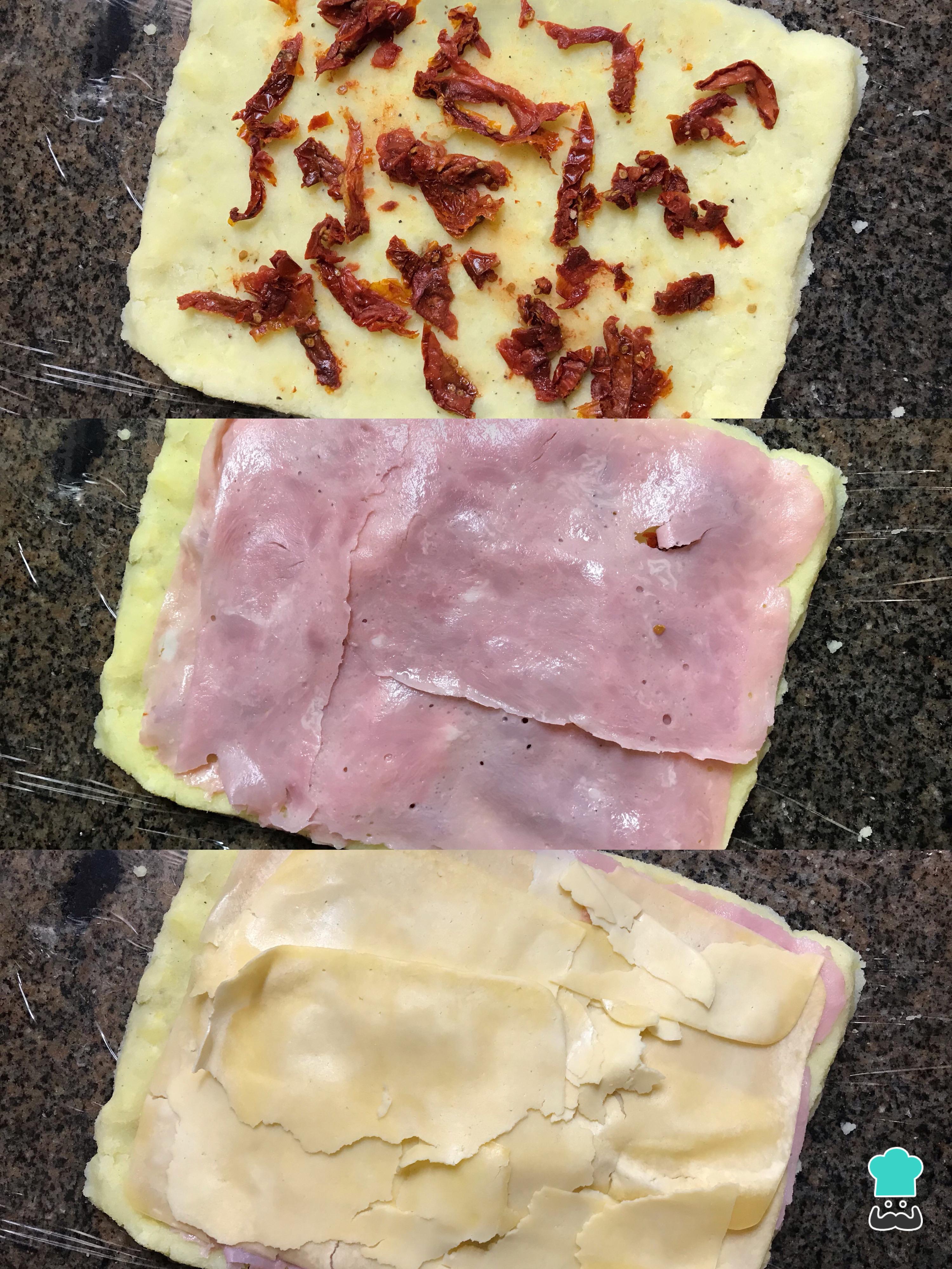 Agrega los tomates secos previamente hidratados, sobre ellos coloca el jamón y, por último, el queso. Puedes hacer el arrollado de papa con el queso que más te guste, mientras esté cortado en lonchas. Igualmente, si quieres hacer un arrollado de papa vegetariano, simplemente elimina el jamón y sustitúyelo por otro ingrediente, como espinacas.
