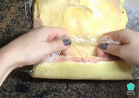 Comienza a enrollar tu arrollado de papa con la ayuda del papel film para ir presionando.
