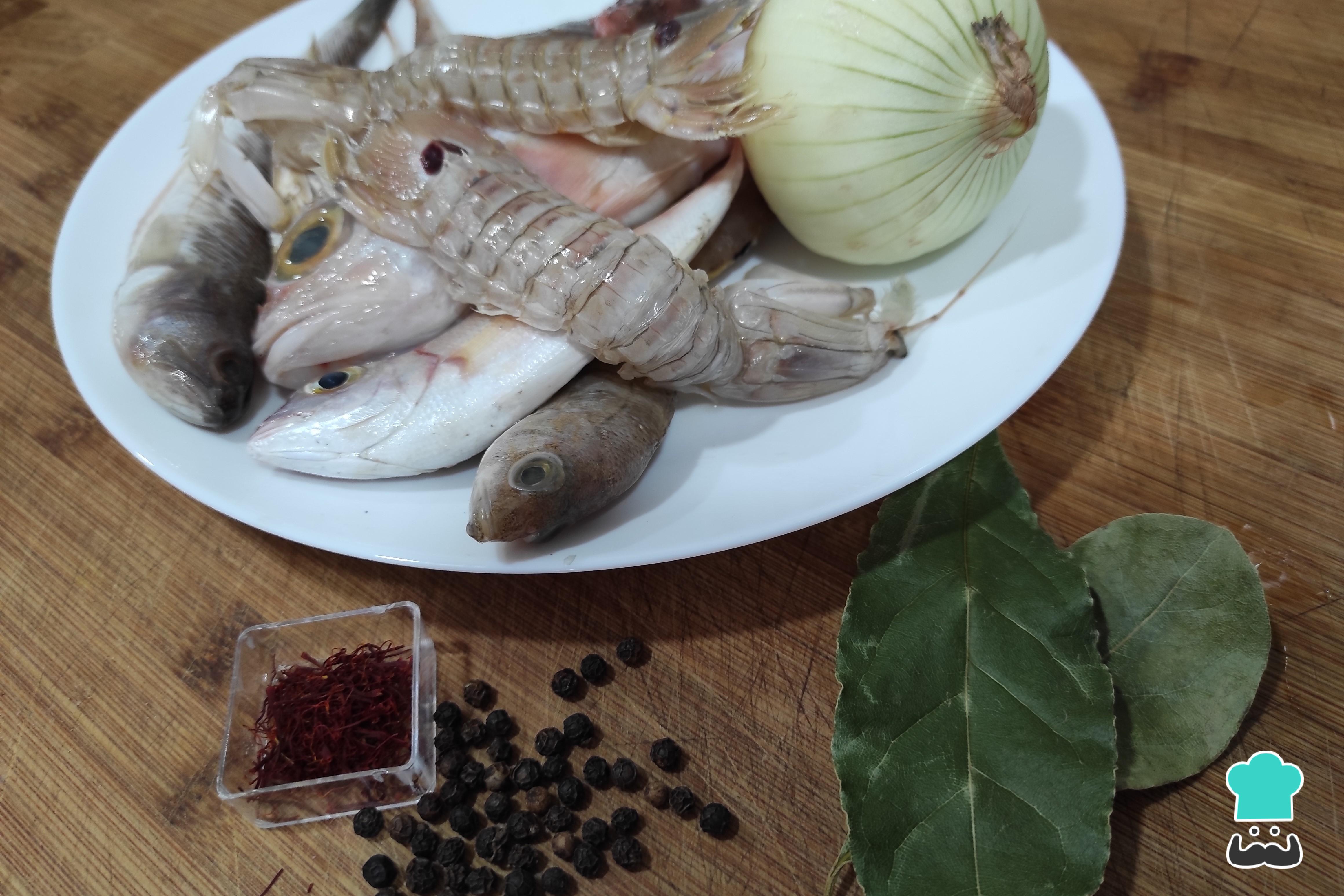 Para comenzar con este arroz a banda con alioli, prepara un fumet de pescado variado con morralla, galeras, cebolla, laurel, pimienta en grano, azafrán y una de las cucharillas de sal. Hierve con un litro y medio de caldo durante una hora. Si haces el caldo de pescado en olla rápida, con 35 minutos será más que suficiente.