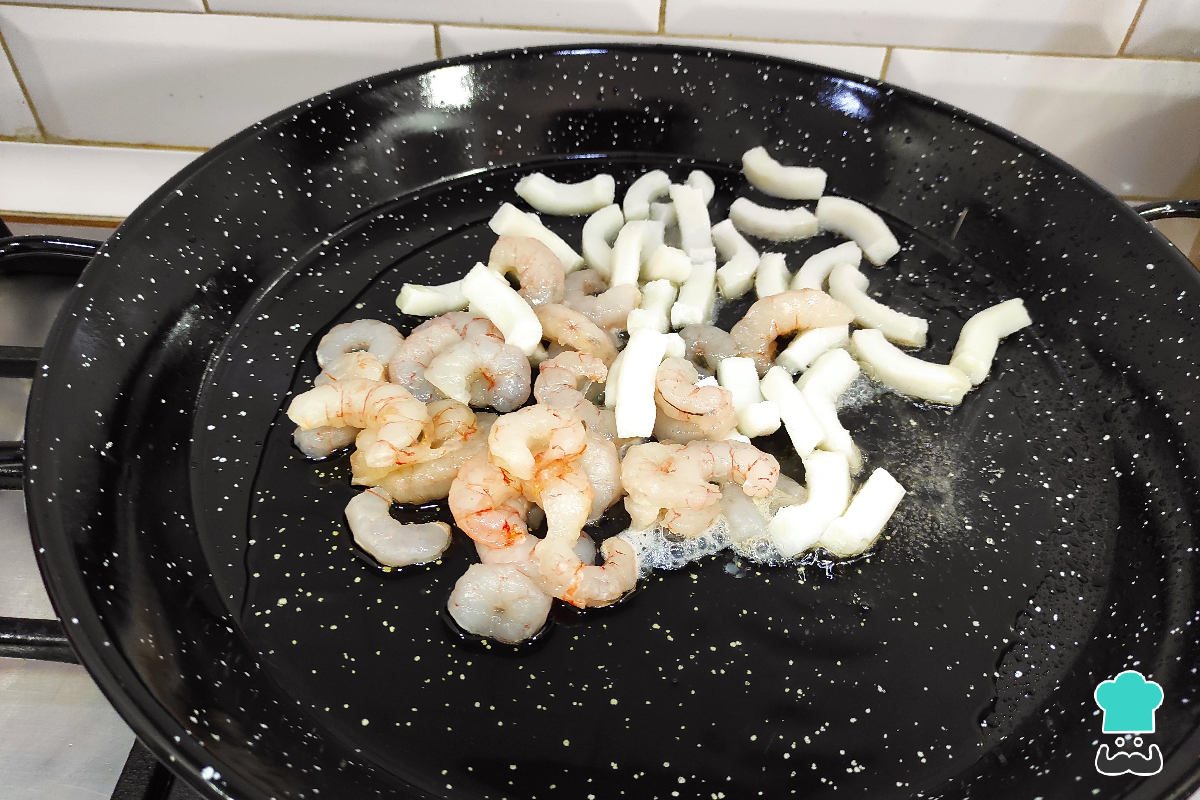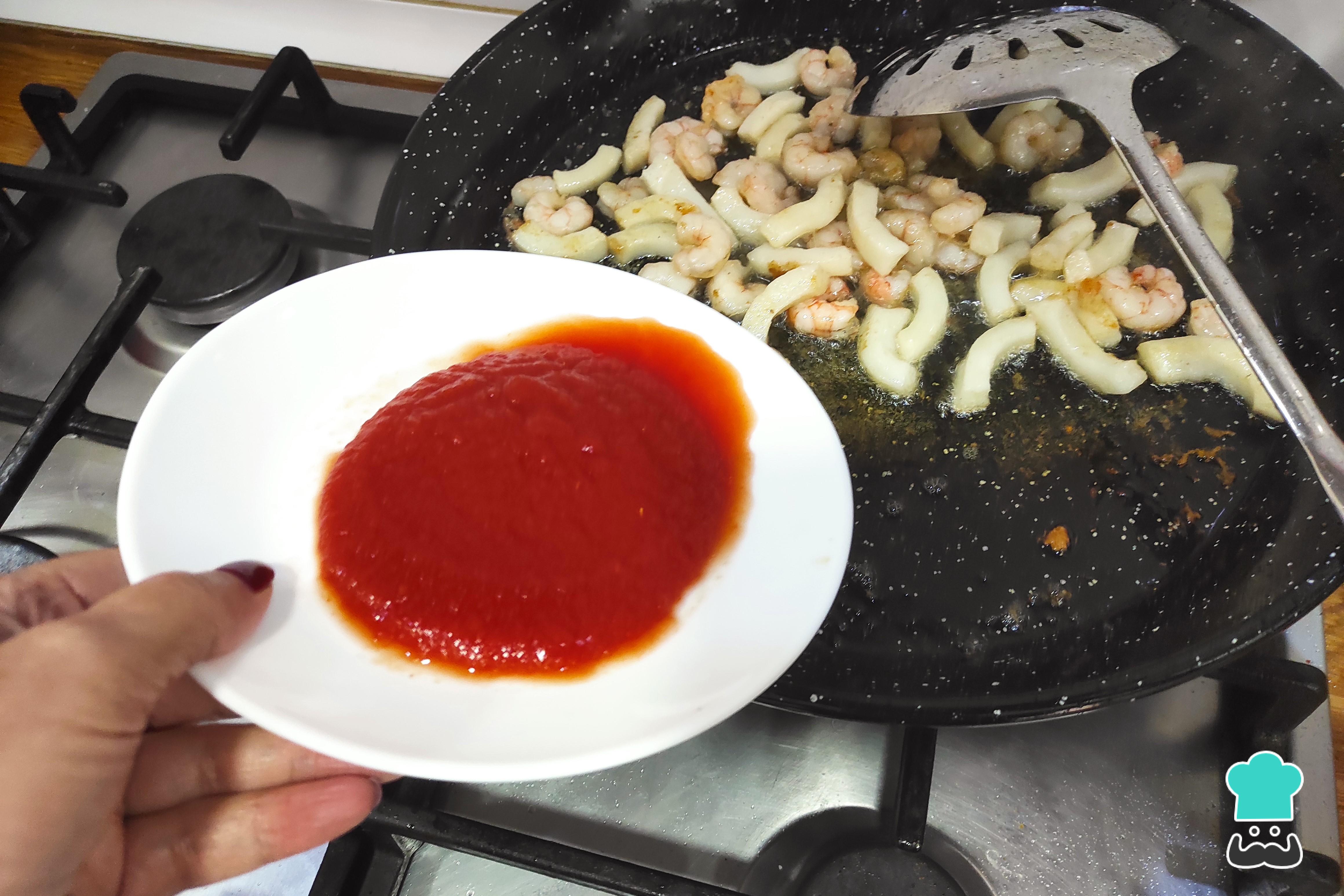 Rehoga las gambas peladas y el calamar a trozos con un chorrito de aceite de oliva, remueve y ve preparando el tomate triturado. Puedes rallar un par de tomates bien maduros en el puesto del tomate natural triturado de lata, pero nunca frito.