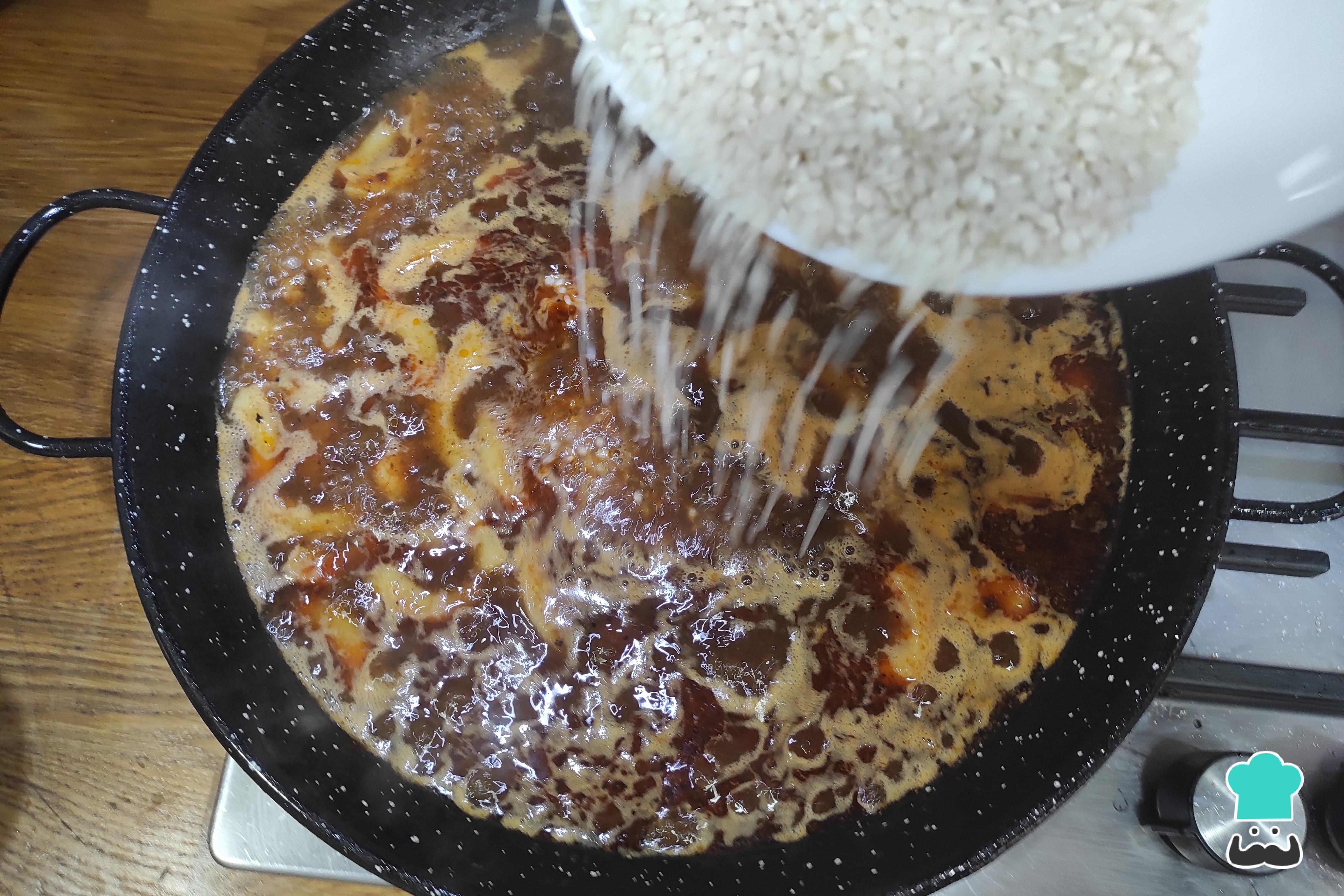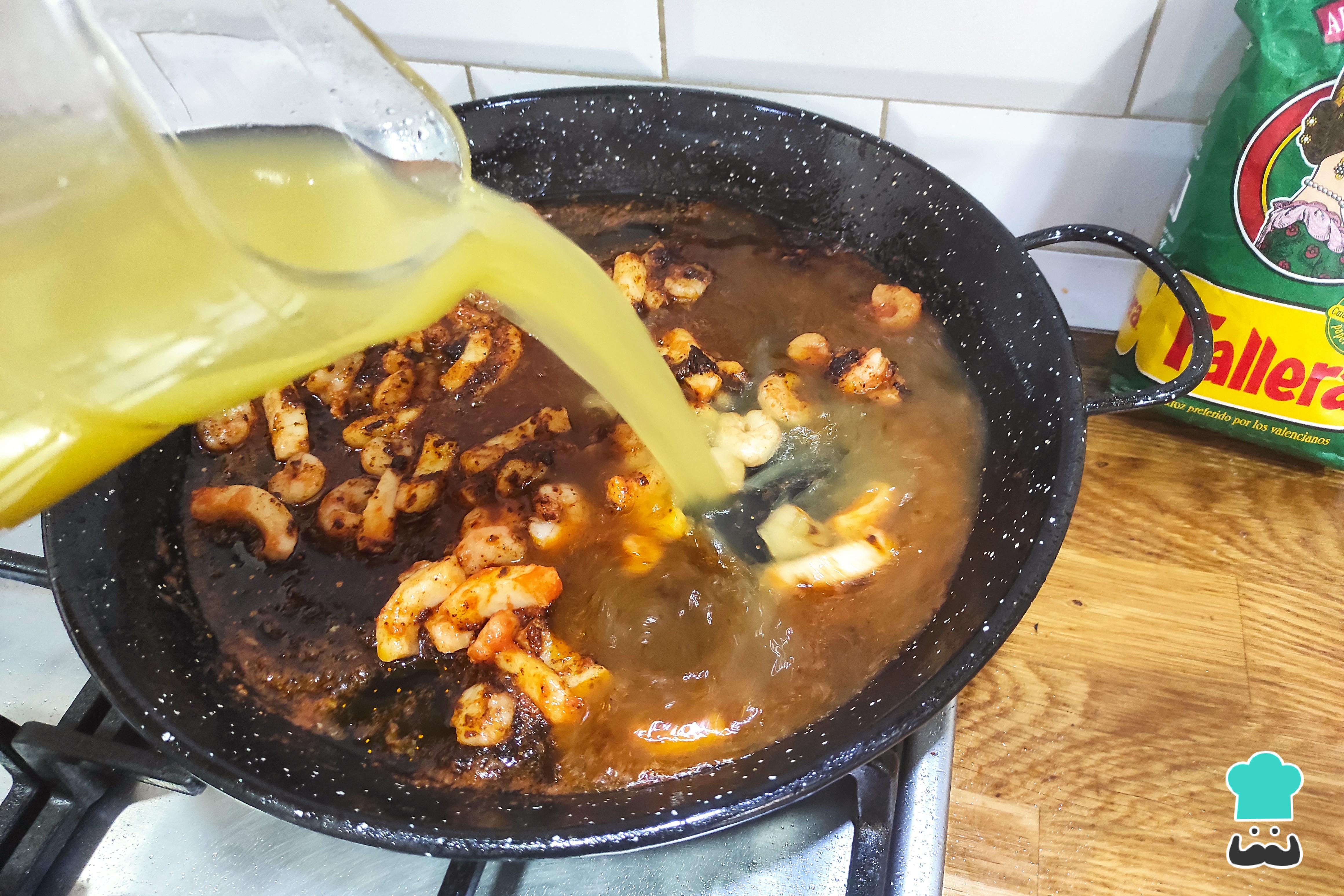 Añade el caldo de pescado o fumet, remueve y deja que comience a hervir un par de minutos para que acabe de integrarse cada sabor de los ingredientes.