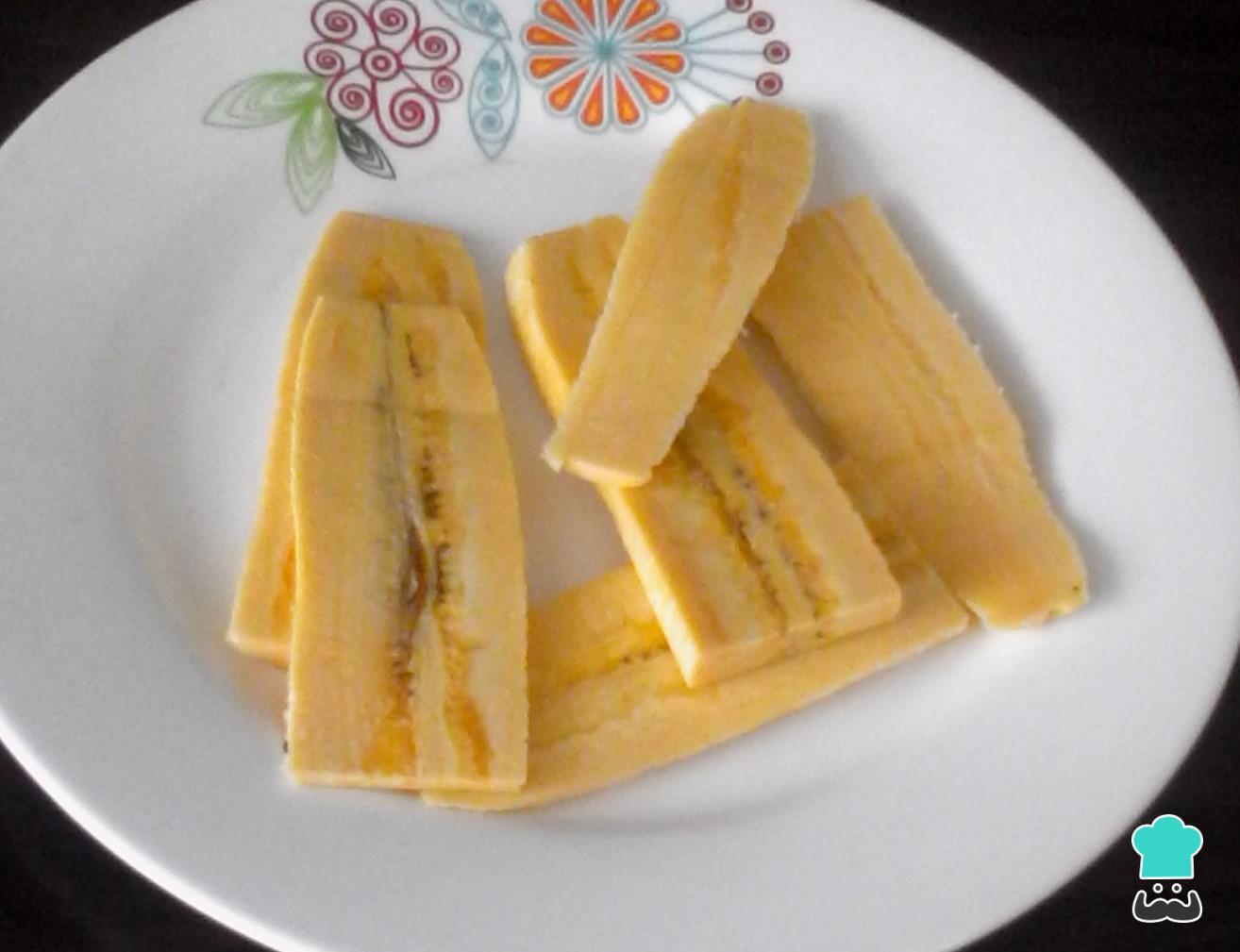 Pelamos los plátanos y los cortamos al gusto, ya sea en rodajas o a lo largo. En otra sartén, con poco de aceite a fuego medio freímos el plátano. Retiramos y colocamos en papel absorbente.