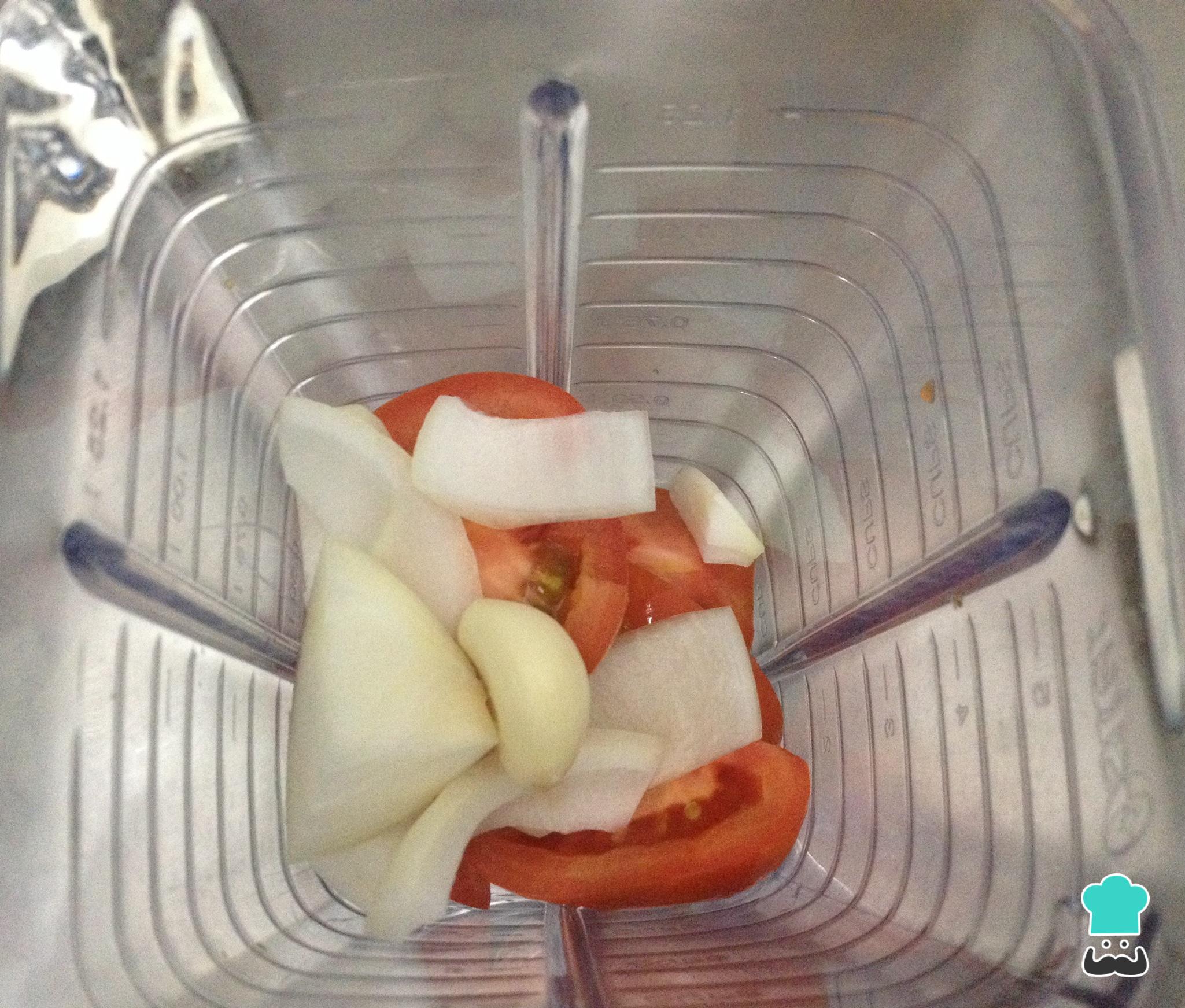 Para hacer la salsa de la receta original del arroz cubano, llevar a la licuadora el tomate cortado en trozos, la cebolla y el diente de ajo. Licuar hasta obtener una consistencia homogénea.