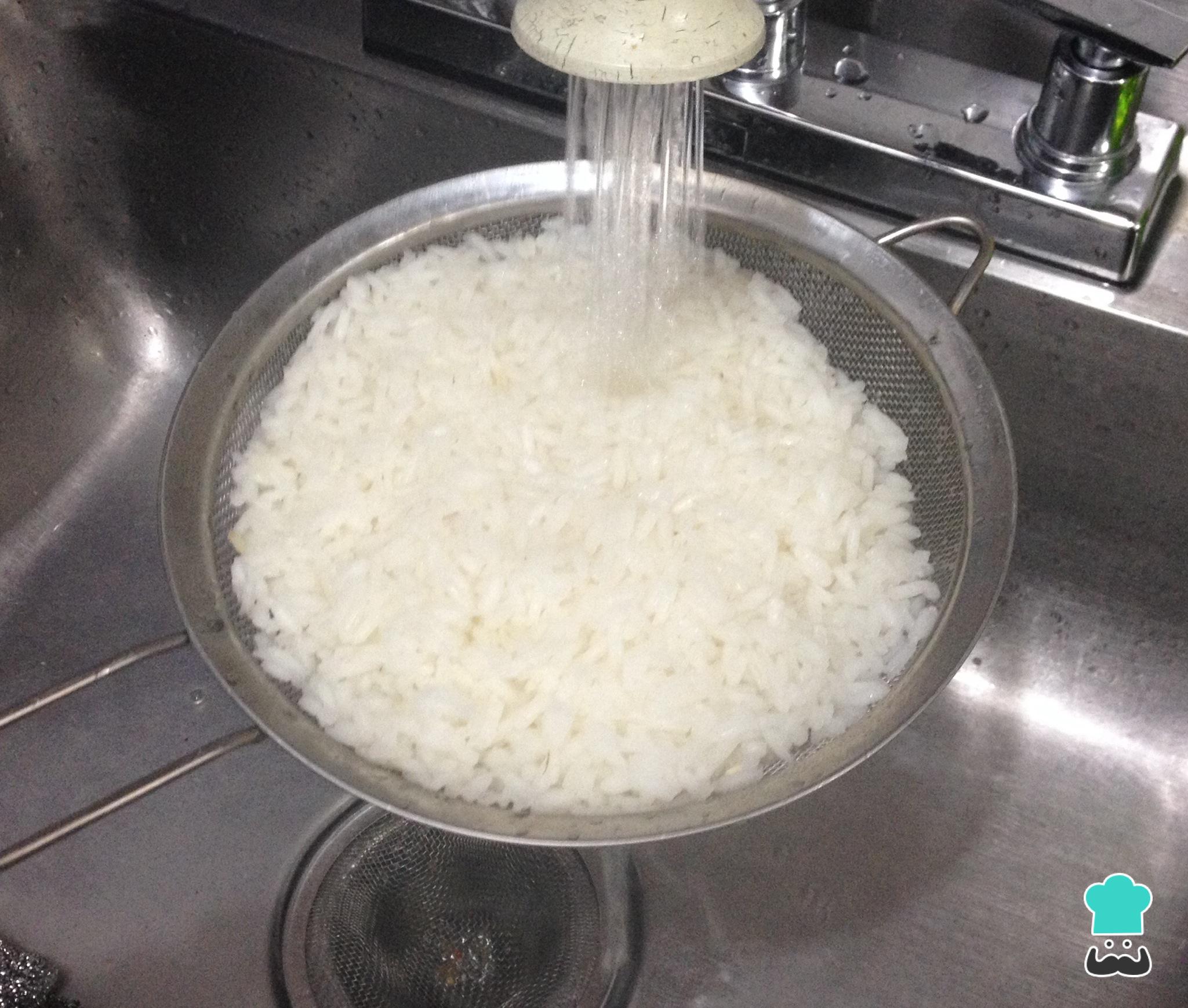 Colar el arroz y pasar por agua fría para evitar que se siga cocinando el grano, reservar.