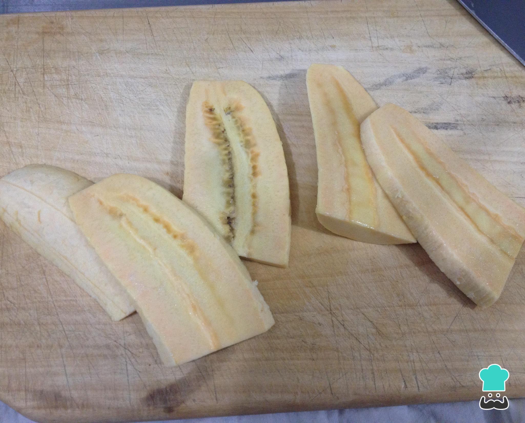 Por último, haremos las tajadas de plátano. Cortar el plátano en rebanadas alargadas, freír en abundante aceite a temperatura media hasta que esté dorado por ambos lados.