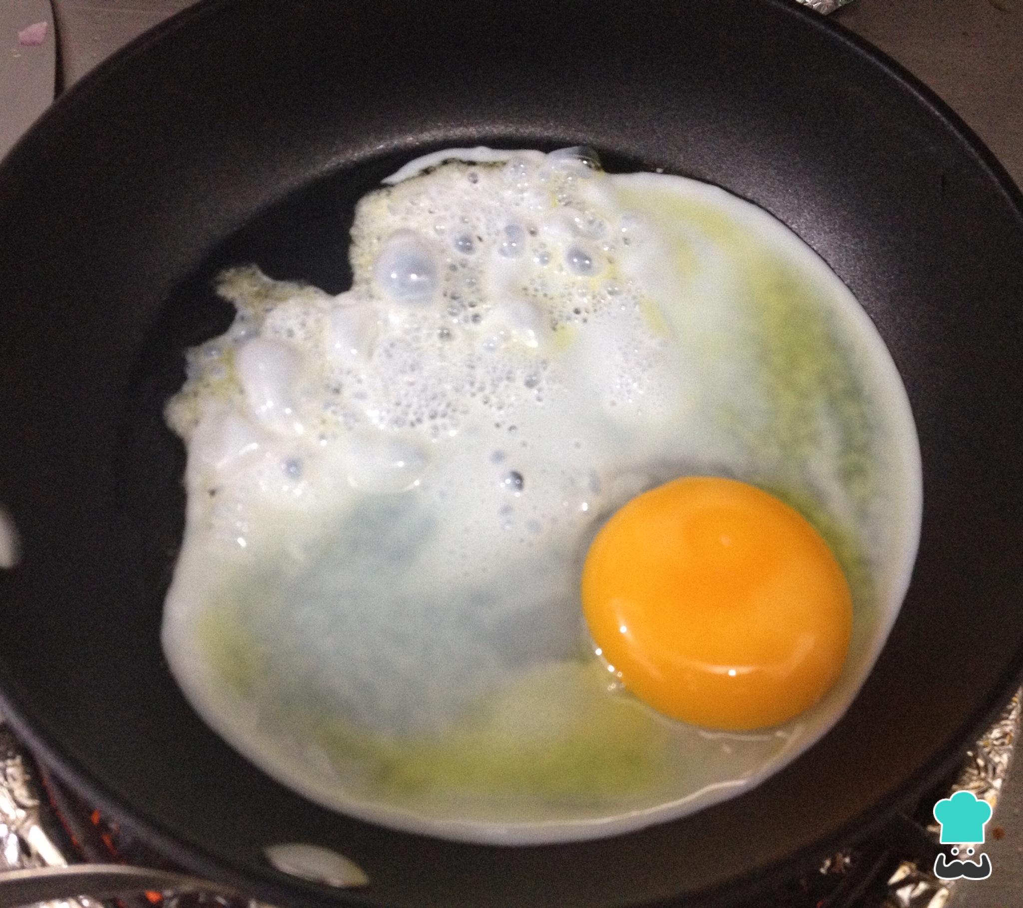 En una sartén a fuego bajo y con aceite, cocinar un huevo entero durante 3 minutos tapado, agregar un poco de sal.