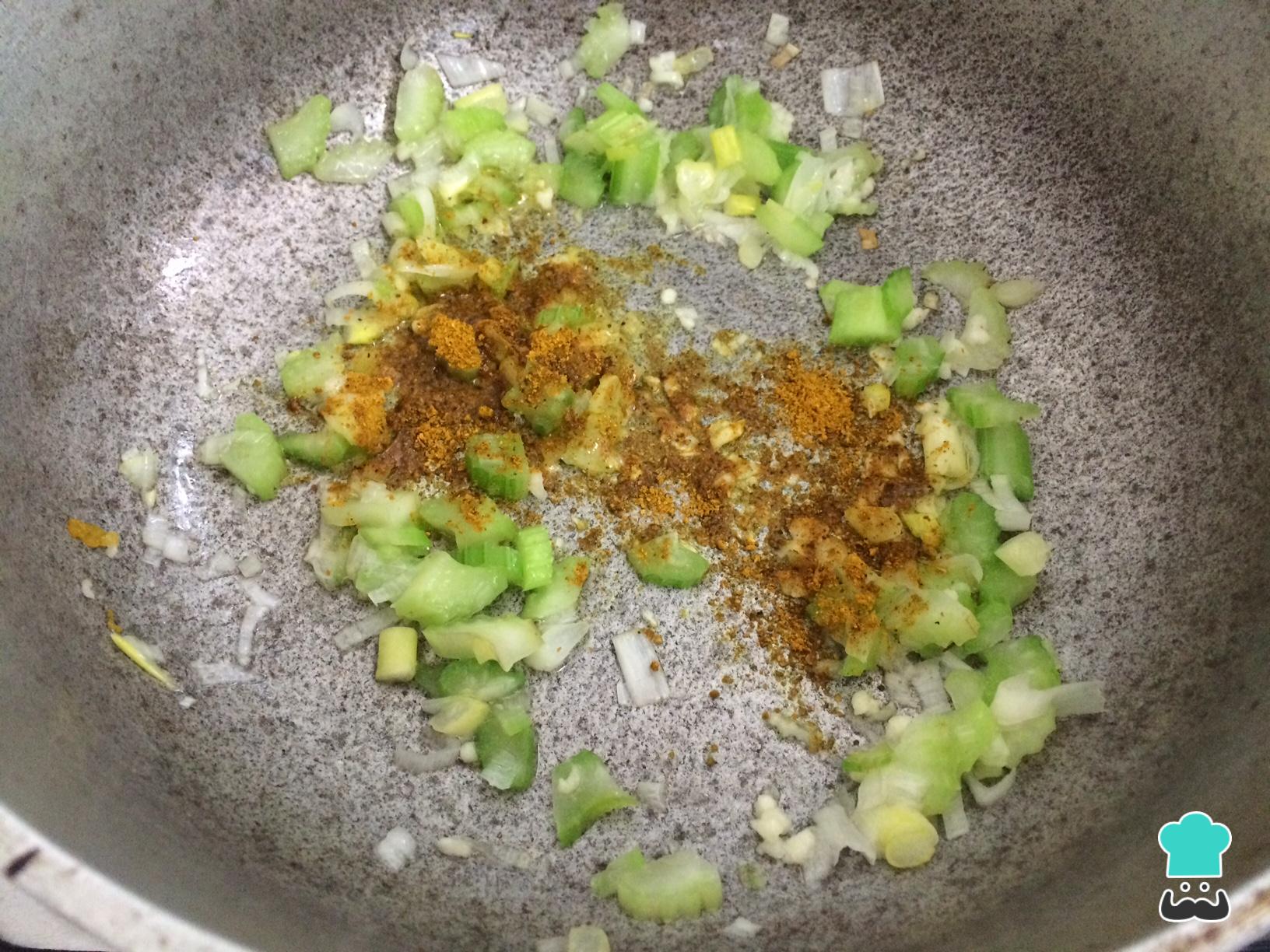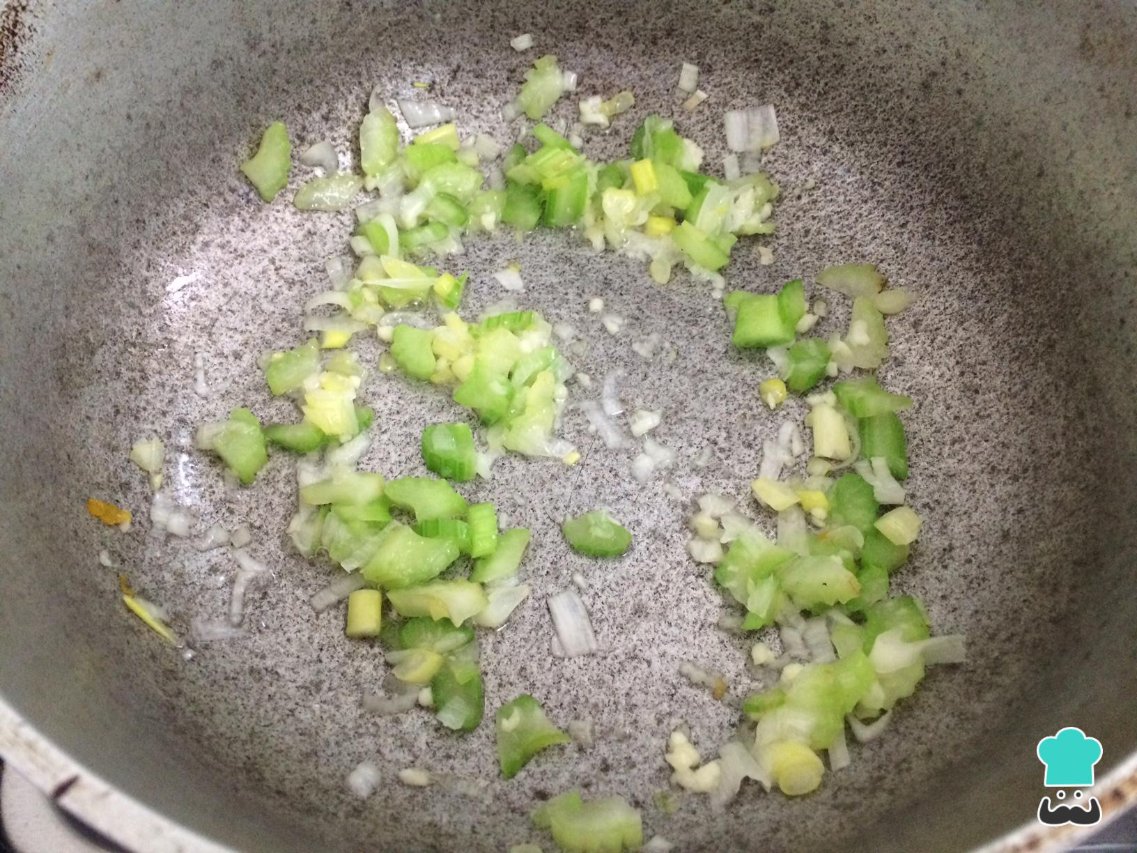 En una olla con aceite a fuego medio, sofríe la cebolla, el apio y el ajo, todo cortado finamente hasta que esté blando.
