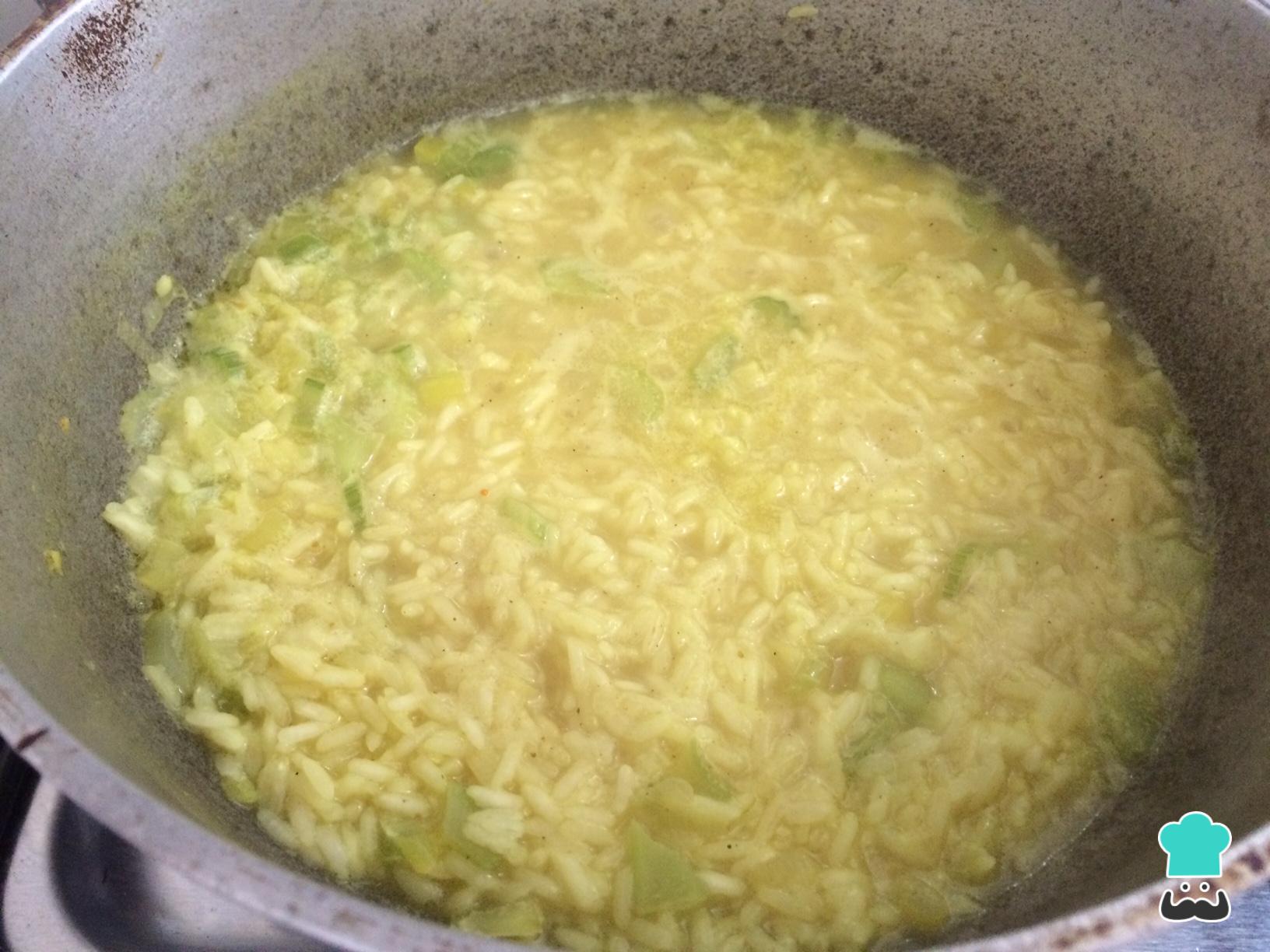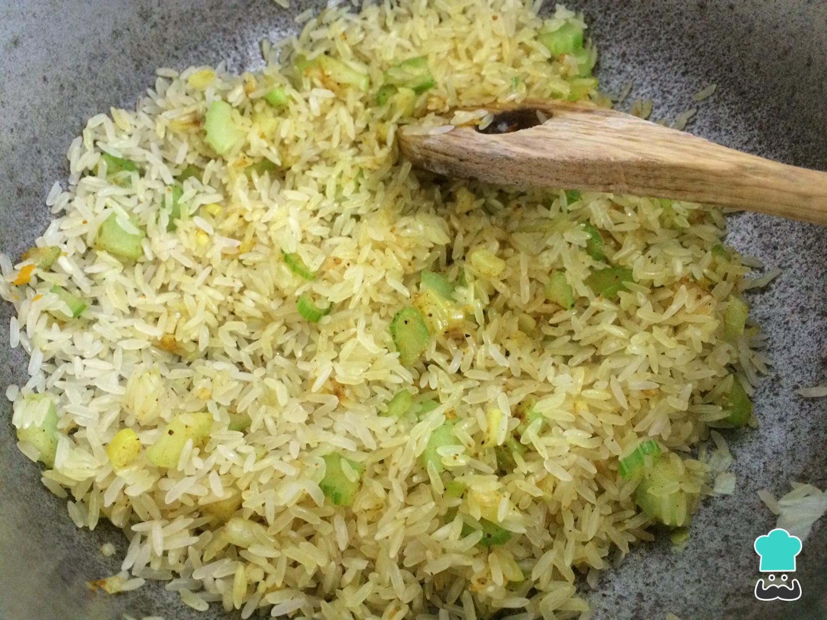 De inmediato, agrega el arroz y revuelve durante unos minutos, hasta impregnar todo el arroz del curry.